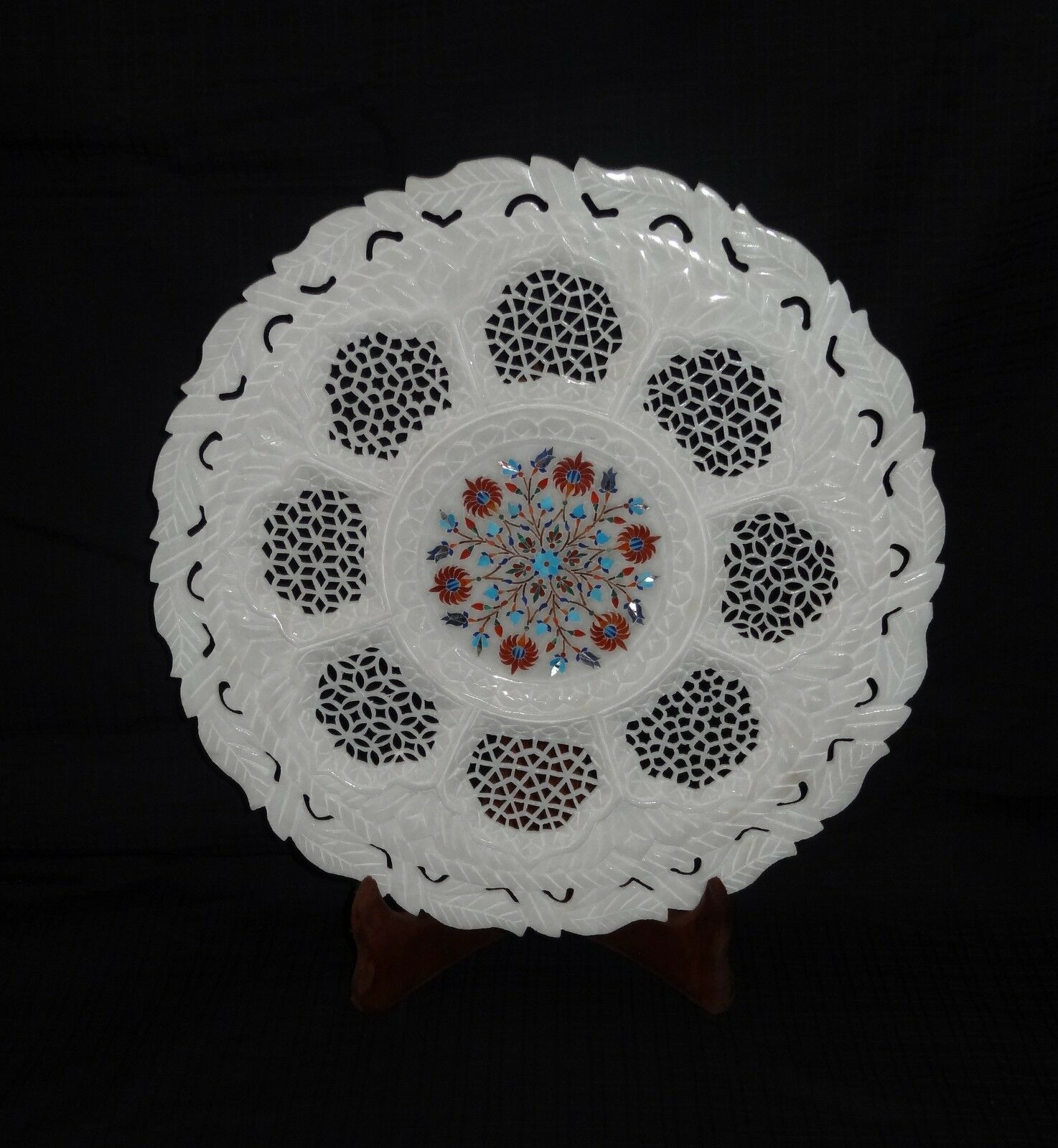 12" Marble Plate Very Fine Inlay Work Pietra Dura Gorgeous Plate Home Decor Art