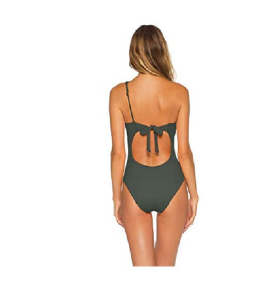 Adeline one shoulder one piece swimsuit features ribbed textured fabrication with adjustable tie cutout back and adjustable, removable shoulder strap.