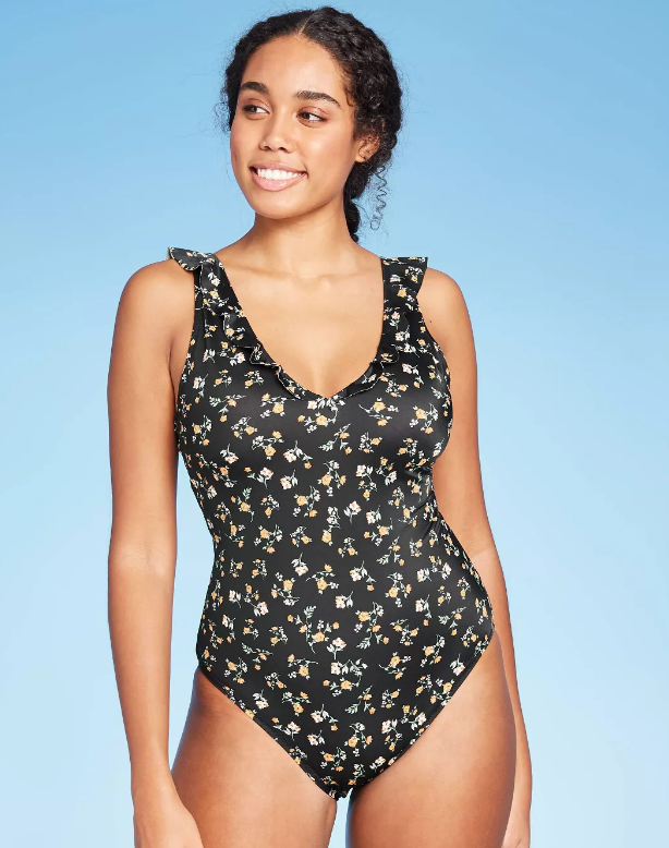 Add a charming twist to your beach-ready look with this Floral Ruffle Neck One-Piece Swimsuit from Shade Shore. This floral print swimsuit decorated with feminine ruffle accents makes a dressy addition to your holiday essentials. Printed with allover florals over a black base, this swimsuit features a smooth stretch construction for comfortable and flexible wear. This one-piece swimsuit with a self-tie on the deep back can be adjusted to give you a customized fit, while the removal cups offer the shaping and coverage you want. Pair with sunglasses, beach slippers and a hat to look your sunshine best.