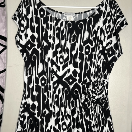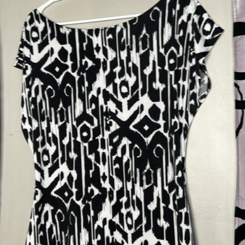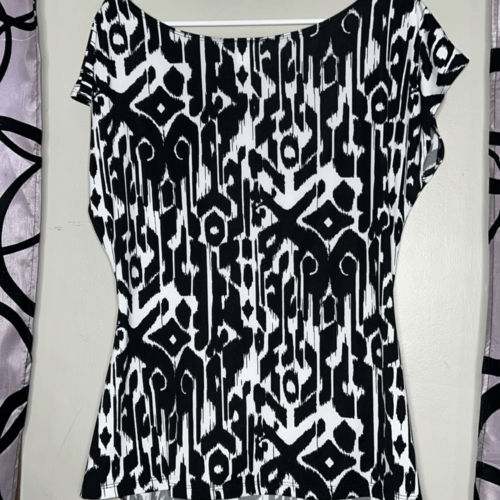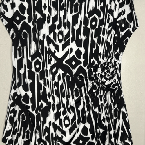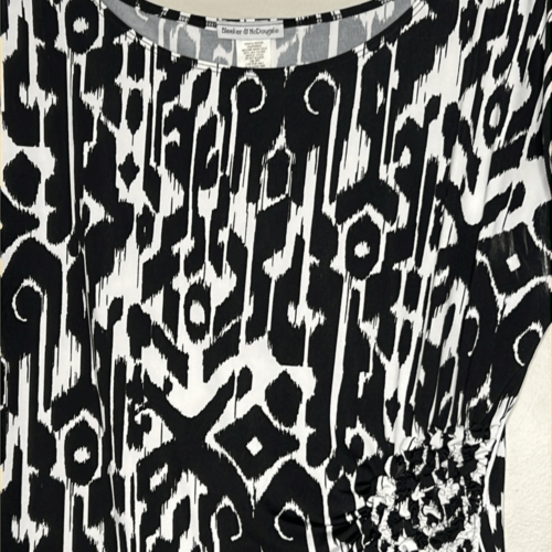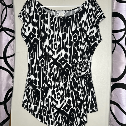 Bleeker McDougal black and white, short sleeve blouse with asymmetric hemline