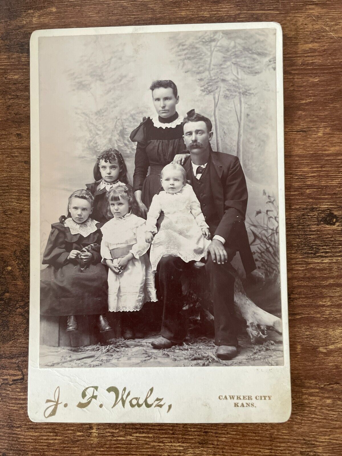 Vintage Cabinet Card. Lon Annie Thornburg with 4 small children by F. Walz in Canker City, Kansas