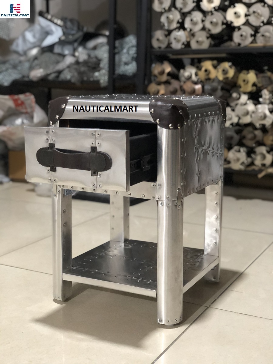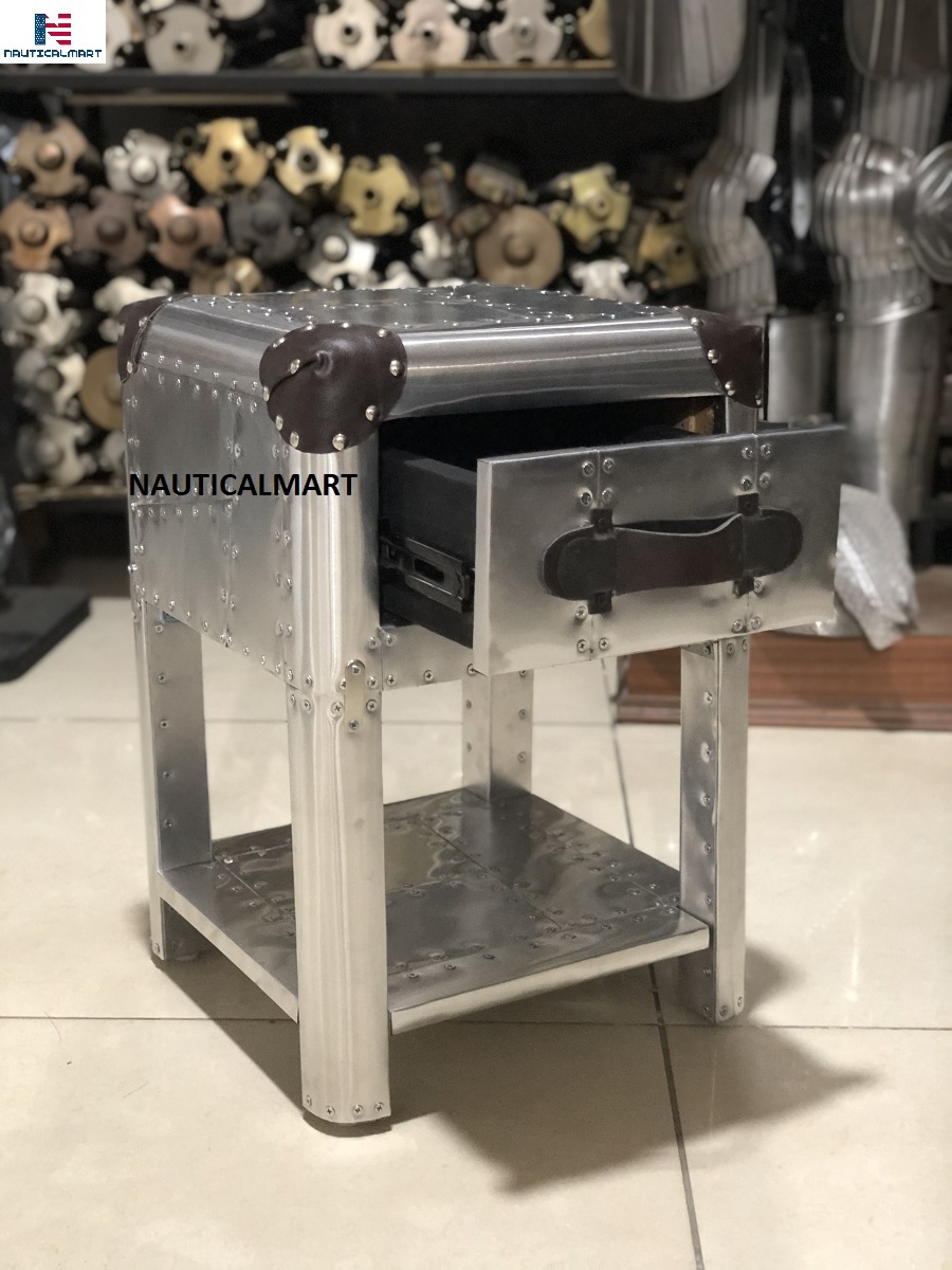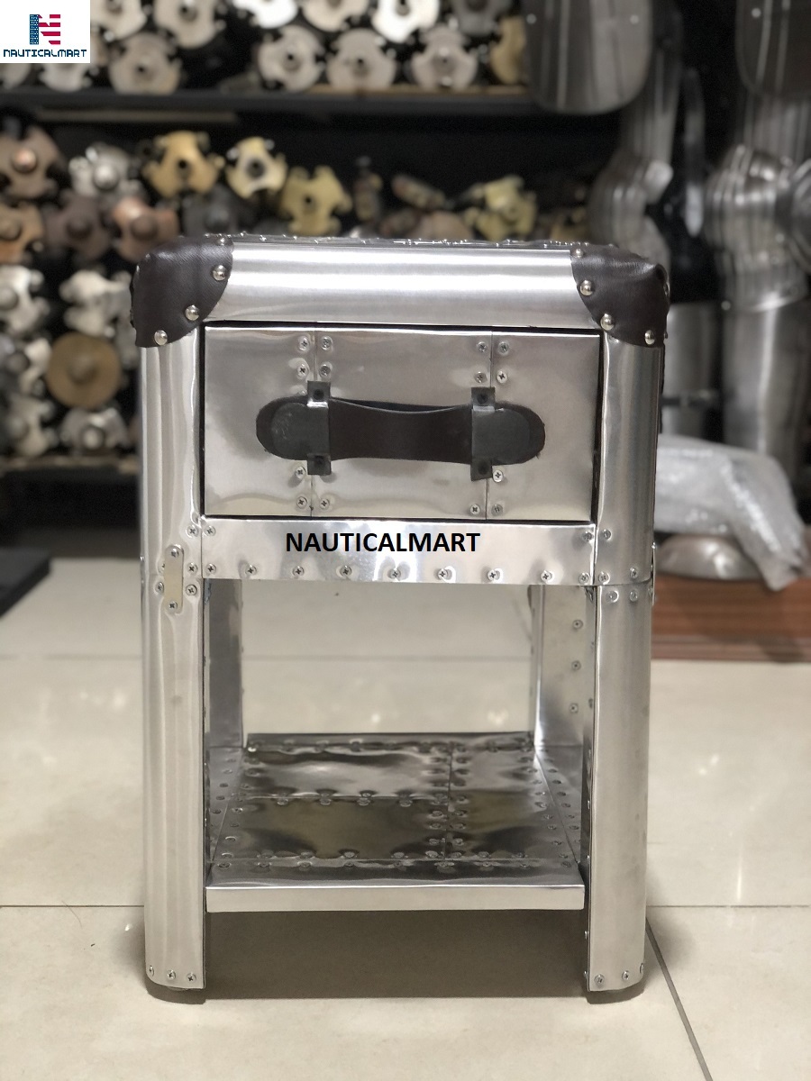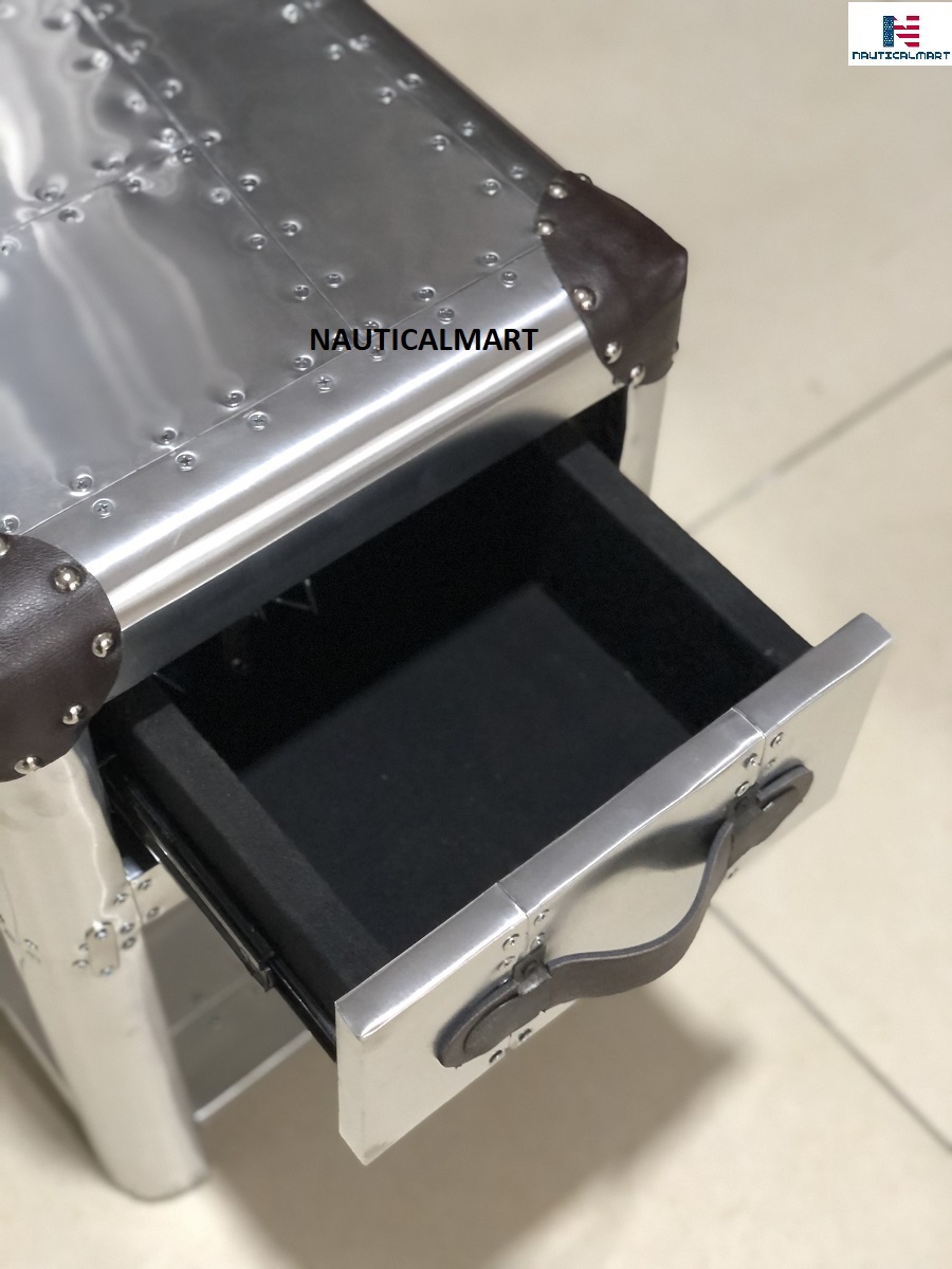 Combining aluminum and steel, the Aviator side Table takes its inspiration after mid-century aircraft construction for your living room. Accented with aluminum rivets and handles, this table offers one spacious fabric-lined drawer and rounded corners that add aerodynamic appeal to the piece and your modern space. Sturdy Aluminium furniture with a wooden frame. A stylish distinctive decorative / industrial look. Supplied fully assembled.