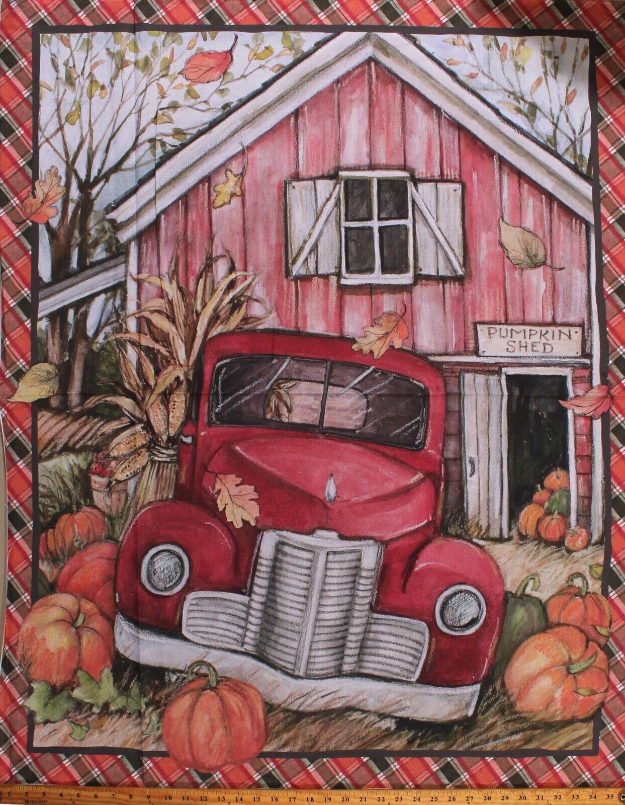 36" X 44" Panel Red Truck Pumpkin Shed Barn Autumn Cotton Fabric Panel D510.74