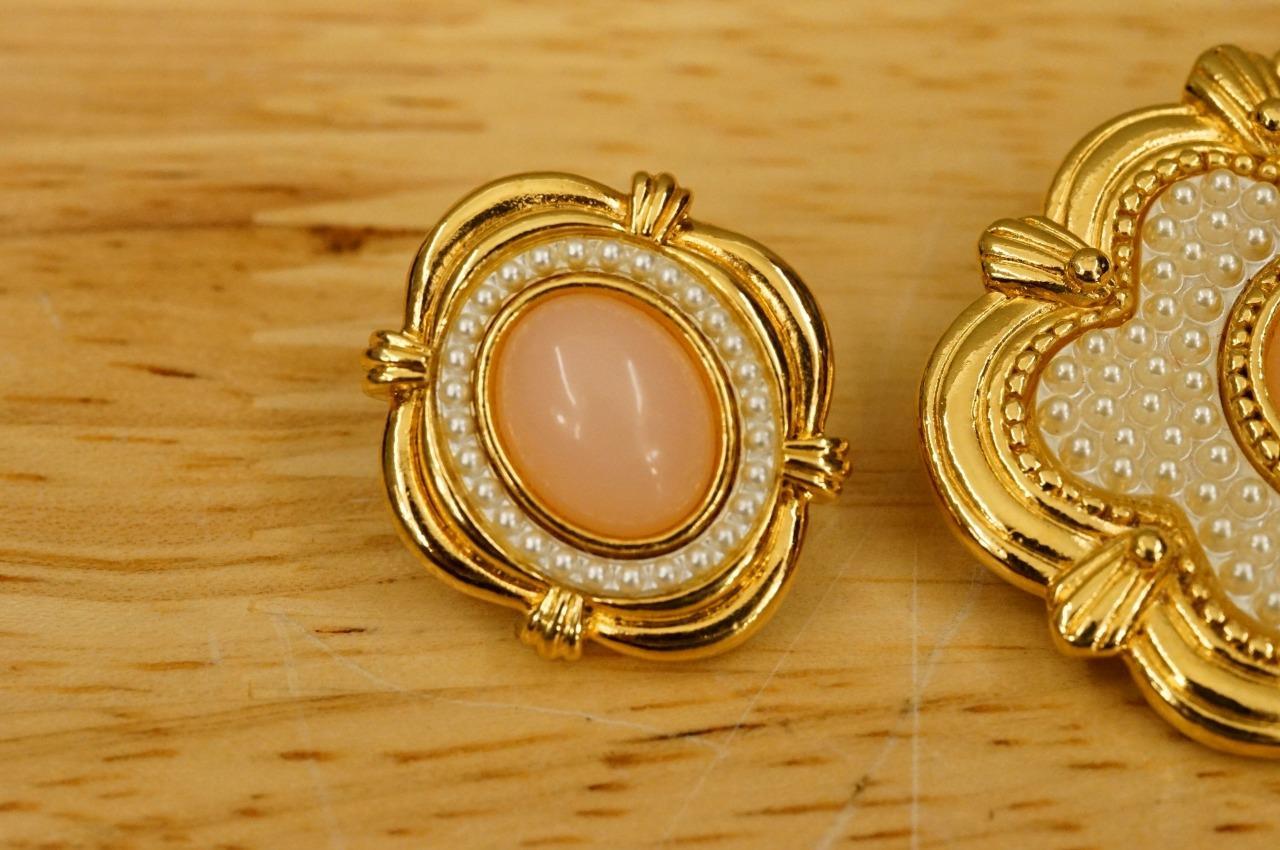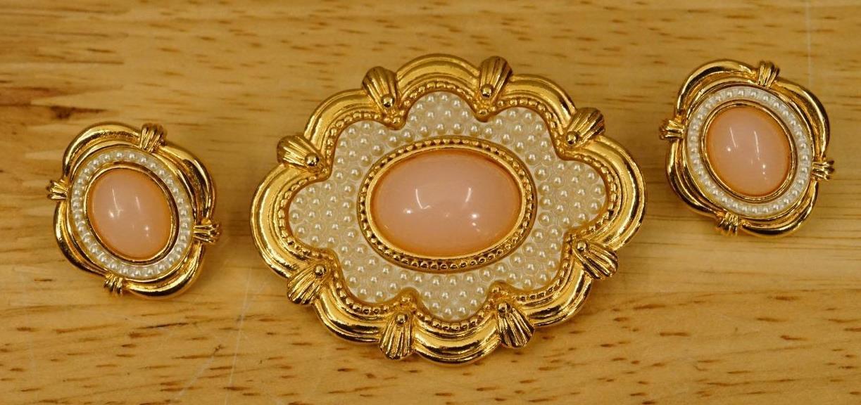 Costume Jewelry AVON Victorian Spring Faux Pearl Brooch Pin Pierced Earrings Set. Pale pink center. Gold tone base metal. Measures 2" wide. Earrings are 7/8" wide and are pierced.
