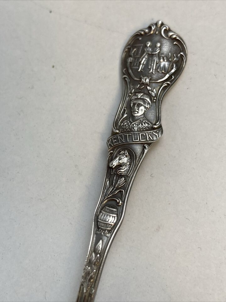 This vintage spoon is a beautiful piece of history to add to your collection. Made by Walker Hall, it features a unique pattern of Daniel Boone and the state of Kentucky. The spoon is composed of sterling silver, adding to its value and elegance.