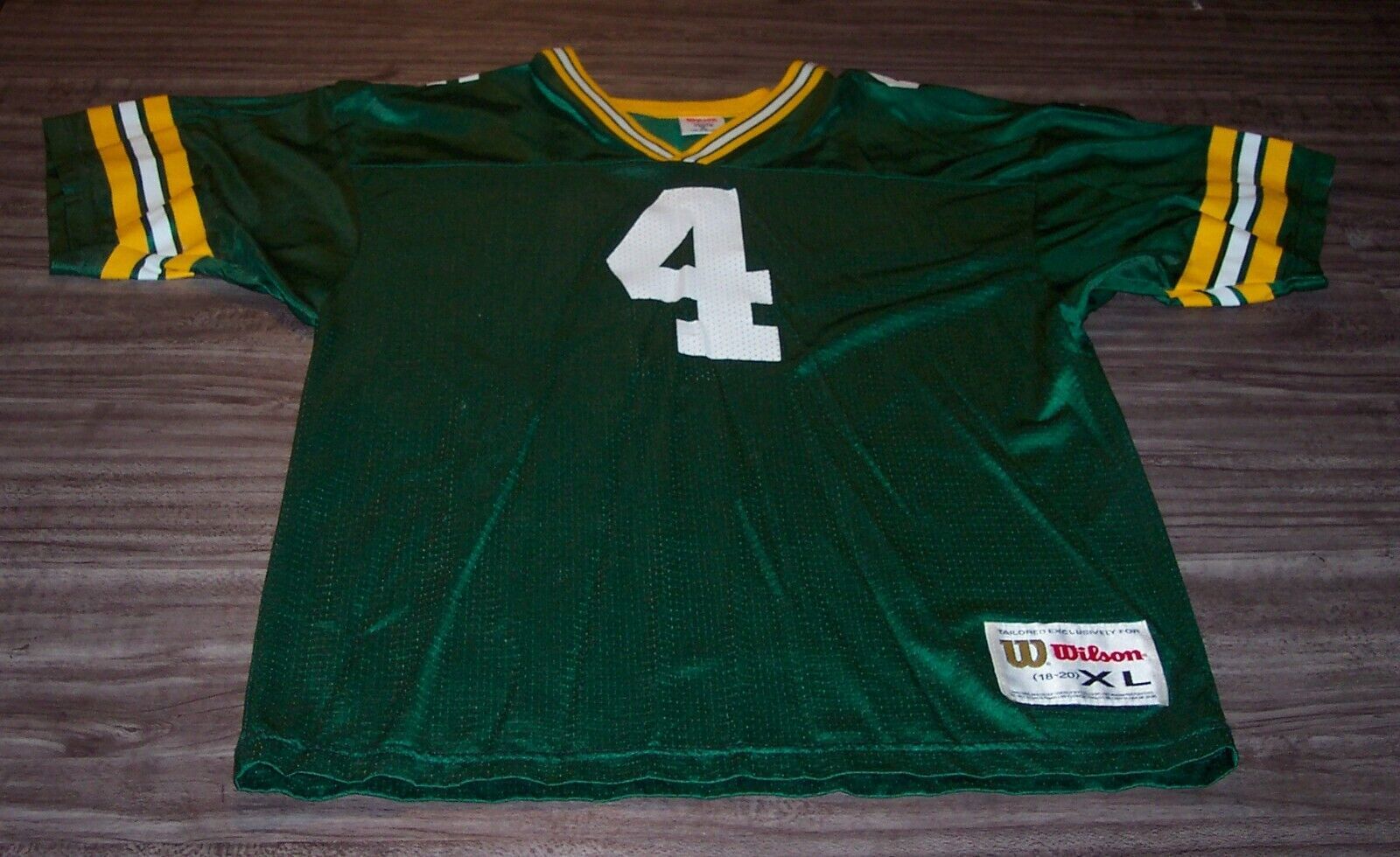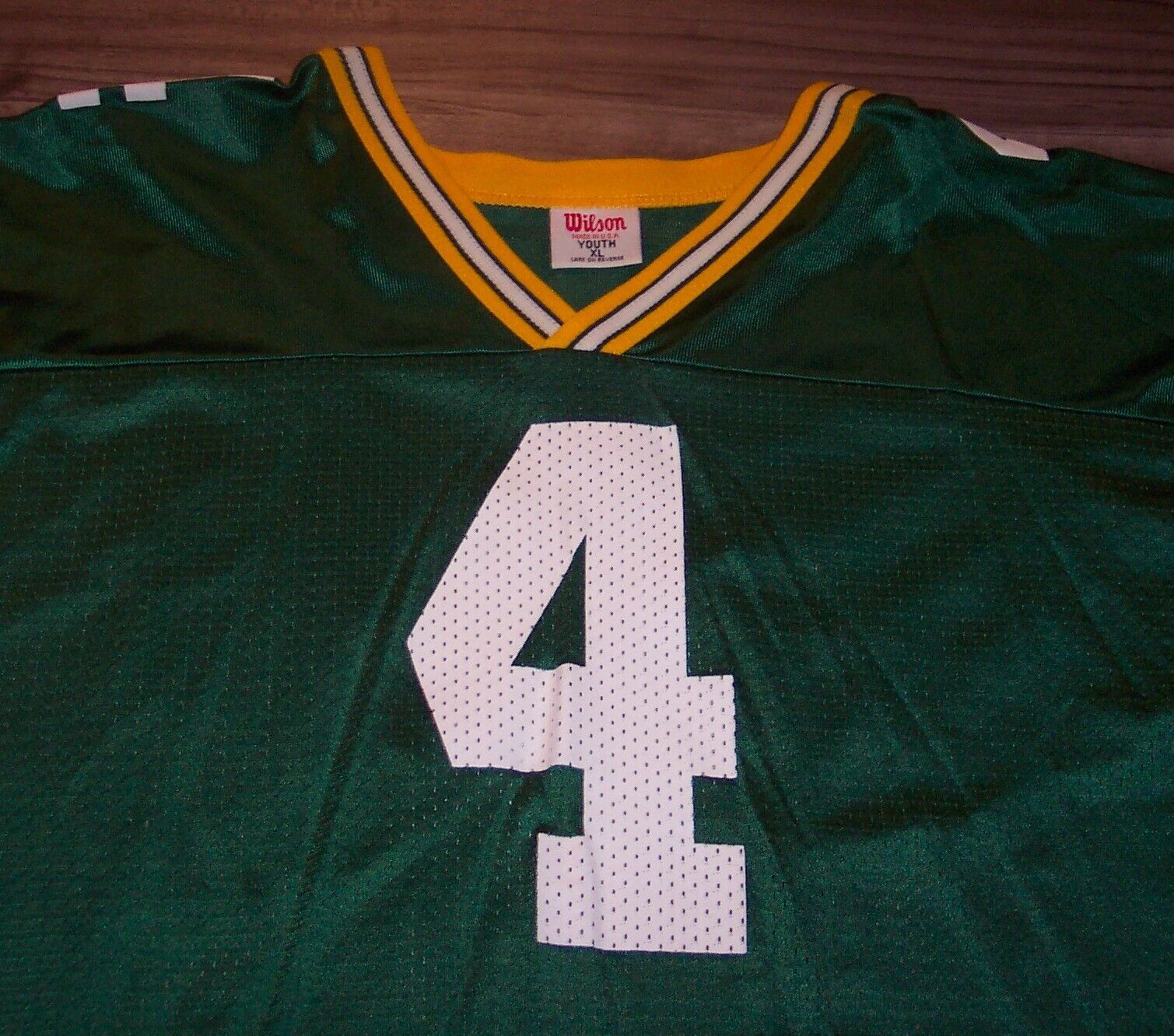 This is a GREEN BAY PACKERS #4 BRETT FAVRE NFL FOOTBALL JERSEY. It is a size YOUTH XL 18-20, and it is in great condition. It is 22 inches from armpit to armpit and 28 inches in length. It is an official WILSON Jersey. Made in the USA. Combine auctions to save on shipping. EAG