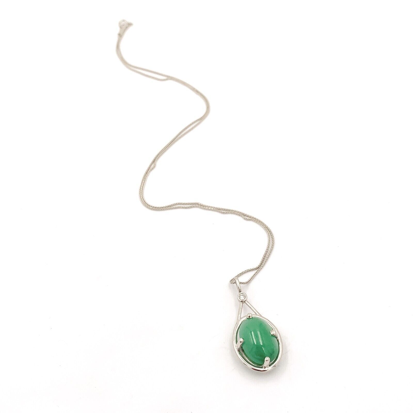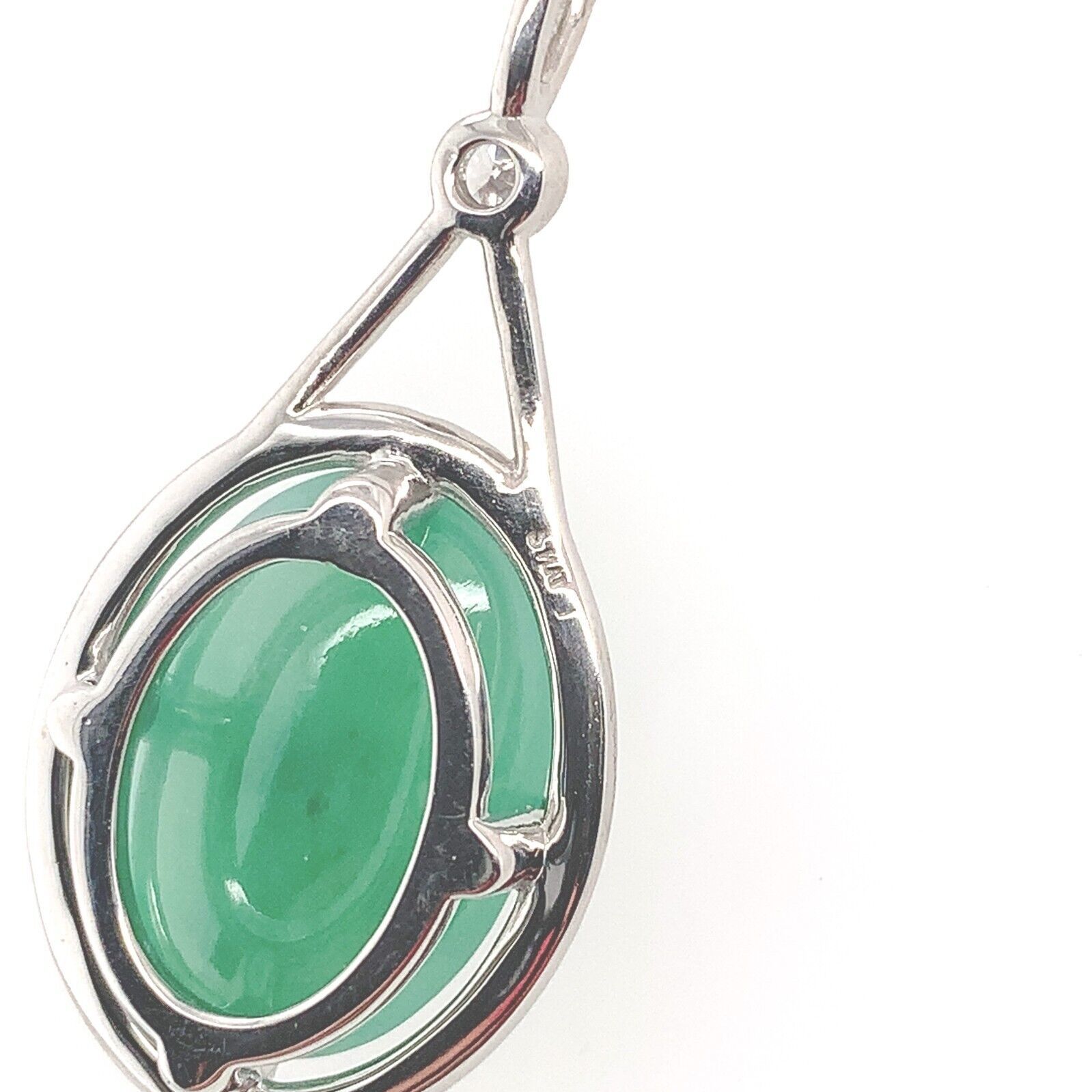 Platinum pendant featuring a large oval green jadeite jade cabochon weighing 9.55 carats. The jade has a GIA report #5234070884 stating natural jadeite grade A, not dyed. The jade measures 15.8mmx x11.04mm x 6.83mm and is translucent with green color - no modifiers. There is a small round brilliant cut diamond accent weighing .06ct.
