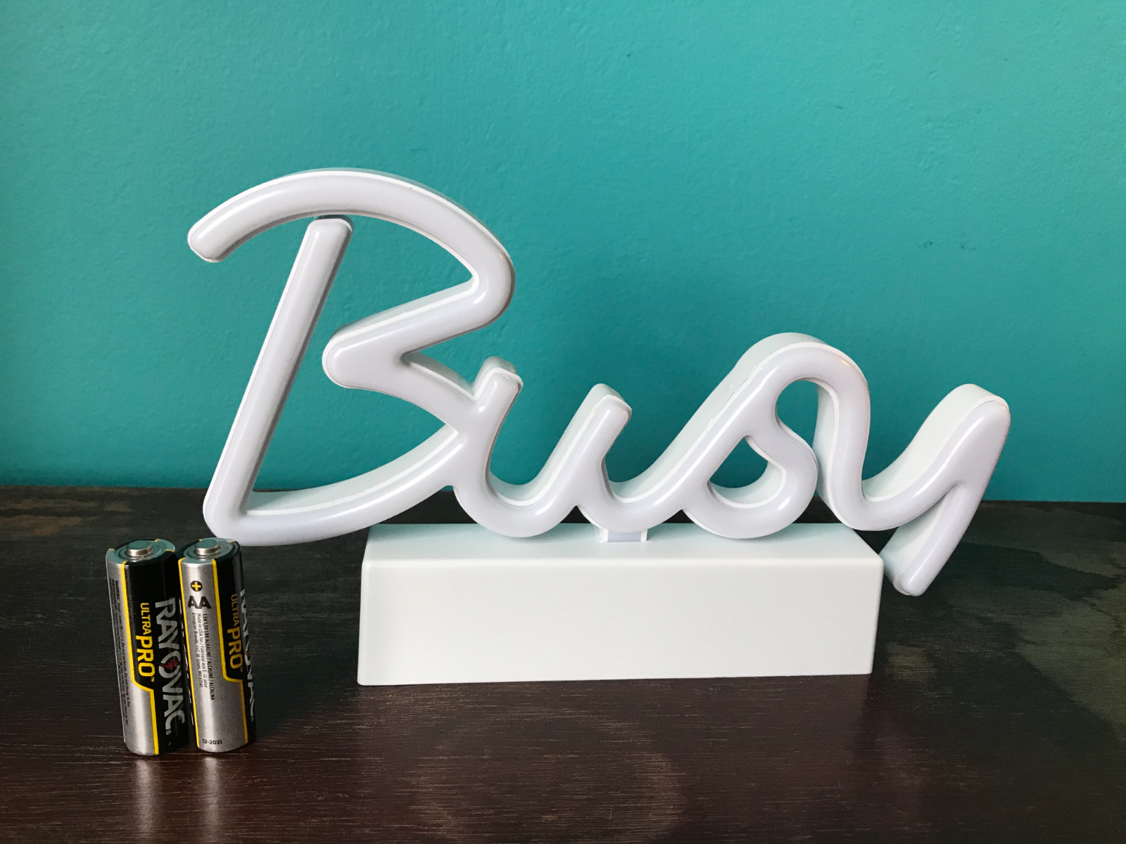 You are getting a great blue led neon sign that reads "Busy" in cursive.