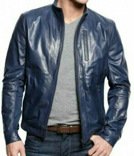 Blue Leather Jacket Men's Motorcycle Jacket Genuine Lambskin Leather Jacket