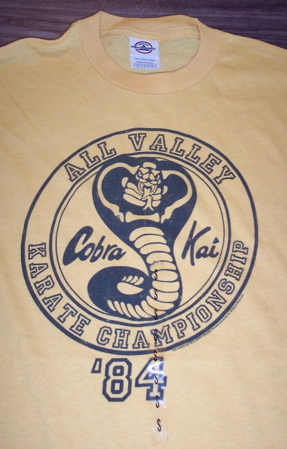 This is a Vintage style KARATE KID 1984 COBRA KAI KARATE T-shirt. It is a size SMALL, and it is NEW. It is 18 inches from armpit to armpit and 28 inches in length. The print is made to look vintage. Combine auctions to save on shipping. AD