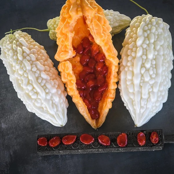 A Customer Favorite! A natural marvel, the purest white bitter melon variety we know, it reminds us of the elegant white pearls found off the coast of Okinawa. The most stunning edible ornamental, this extra large and mild Japanese bitter melon bears pearly white, mellow-flavored fruit. Refined, less bitter flavor that is still quite nutritionally potent and health promoting. Okinawan bitter melon has been identified as one of the key dietary staples contributing to the world-famous longevity of the people of this beautiful Japanese island. The lightly bitter flesh has been shown to have medicinal value in regulating blood sugar! Interestingly, the bitter melon does develop a sweetness as it ripens. When fruit is mature, a sweet, bright red sac forms around the seeds. The seed pulp of this variety is the best of any bitter melon we have tried, a sweet cherry candy flavor! The thick fruit averages 8-10 inches long. The fruit is typically cut thick and added to soups or shaved thin and eaten raw; we have found the flavor to be by far the most superior of all bitter melon. This may be the truest Okinawan treasure, a beautiful secret to longevity and good health!
