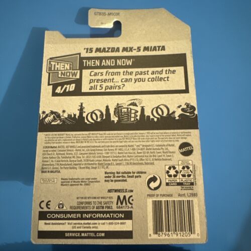 This Hot Wheels Then and Now 4/10 model, the '15 Mazda MX-5 Miata, is a fun addition to any car lover's collection. The detailed diecast car features a red body with white 10 spoke wheels, and comes in an unopened box that will ship securely. The vehicle is recommended for children aged 3 and up, and is suitable for both boys and girls.