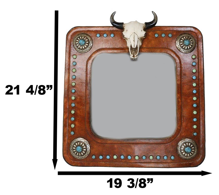 ? Enhance your Western-inspired decor with our Western Bull Cow Skull Mirror framed in Faux Tooled Leather borders. This unique wall mirror combines rugged charm with southwestern flair, featuring a prominent bull cow skull surrounded by eye-catching turquoise silver conchos. The faux tooled leather borders add a touch of rustic elegance, creating a distinctive and visually appealing piece. It makes a bold statement for those who appreciate Western aesthetics.