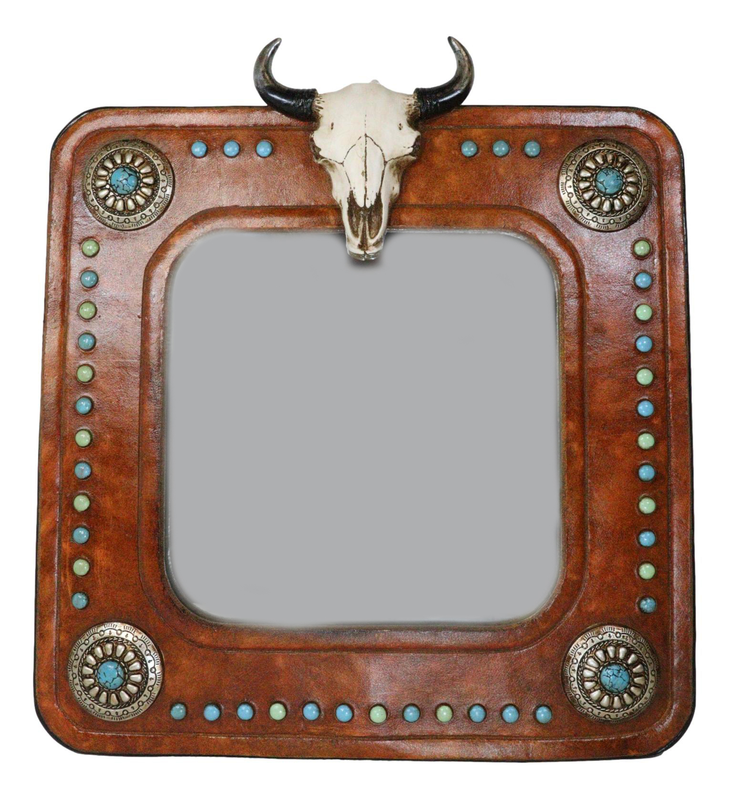 Rustic Western Bull Cow Skull And Turquoise Silver Conchos Faux Leather Mirror