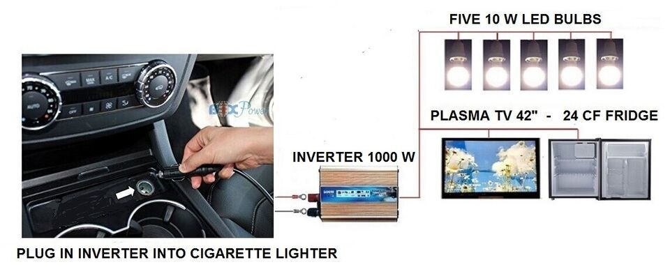 TURN A CAR INTO A POWER PLANT WITHOUT NOISE OR GASES. INVERTER 12 VOLTS DC / 110 VAC. PRODUCES 110 VOLTS AC - 1000 WATTS CONNECTED TO THE VEHICLE'S LIGHTER OR BATTERY. AUTOMATICALLY DISCONNECTS BEFORE THE BATTERY IS DISCHARGED. WORKS 4 TO 6 LOW CONSUMPTION LED BULBS FOR MORE THAN 8 HOURS, FAN, COMPUTER, 42'' PLASMA TV AND SMALL FRIDGE. PROVIDES ELECTRICAL ENERGY IN THE HOUSE IN CASES OF EMERGENCY, BLACKOUTS OR HURRICANES. AN EFFECTIVE AND VERY ECONOMIC SOLUTION VERSUS POWER PLANTS THAT PRODUCE NOISE AND POLLUTES THE ENVIRONMENT. PRODUCT PERFORMANCE : INPUT DC 12 V AC, OUTPUT 110 VDC - FULLY FUNCTIONAL PROTECTION CIRCUIT - CONVERSION EFFICIENCY UP TO 80% - LOW INTERFERENCE TECHNOLOGY - SOFT START FUNCTION - SMALL SIZE, LIGHT WEIGHT, NO NOISE OPERATION. LOW BATTERY ALARM :9.5 - 11.0 VOLTS .LOW BATTERY SHUTDOWN : 9.0 - 10.5 V