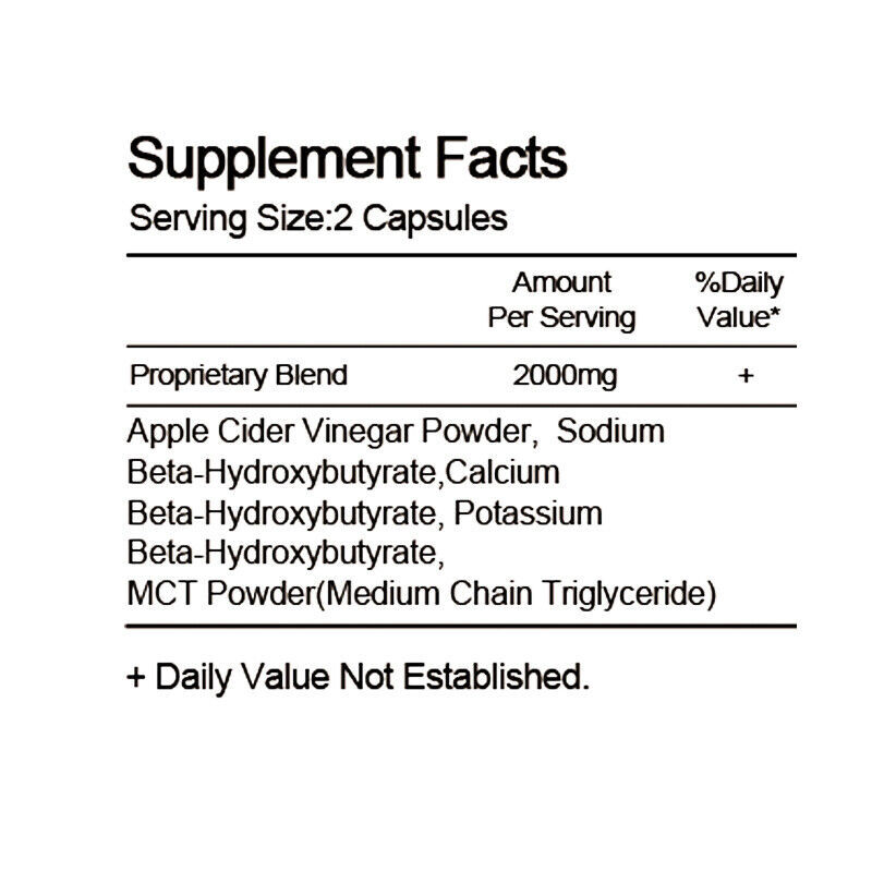Supplement FactsServing Size: 2 Capsules Proprietary Blend 2000mg Apple Cider Vinegar Powder?Sodium Beta-Hydroxybutyrate,Calcium Beta-Hydroxybutyrate, PotassiumBeta-Hydroxybutyrate, MCT Powder(Medium Chain Triglyceride)