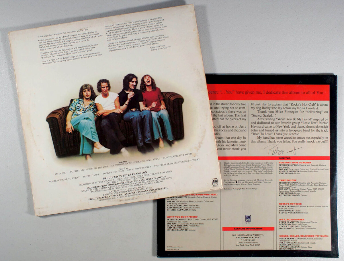 I'm in You, by Peter Frampton, is the follow-up studio album to his massively successful live release Frampton Comes Alive!, showcasing a shift toward more R B-influenced sounds with contributions from notable guests including Stevie Wonder, Mick Jagger on backing vocals, Richie Hayward, and Mike Finnigan. A unique aspect includes its recording at Electric Lady Studios and its status as Frampton's most commercially successful studio album, reaching No. 2 on the US Billboard 200, topping the charts in Canada, and earning platinum certification. The title track I'm in You stands out as a popular soulful ballad and fan-favorite, becoming Frampton's biggest hit single by peaking at No. 2 on the Billboard Hot 100 for three weeks and hitting No. 1 on the Cash Box chart. Other tracks like (Putting My Heart) On the Line and a cover of Stevie Wonder's Signed, Sealed, Delivered I'm Yours also gained attention, though the album as a whole carried high expectations from his prior live triumph. The album solidified Frampton's prominence in the late 1970s rock scene despite mixed critical reception compared to his live work.