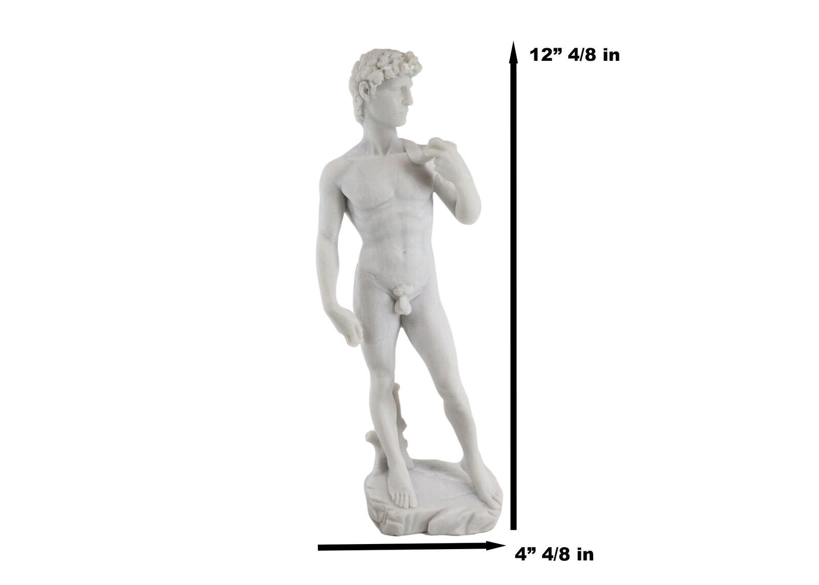 ? This Classical Michelangelo King David Statue measures approximately 12.25" tall, 4.75" long and 3.25" wide. It weighs about 2 pounds.