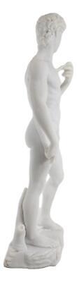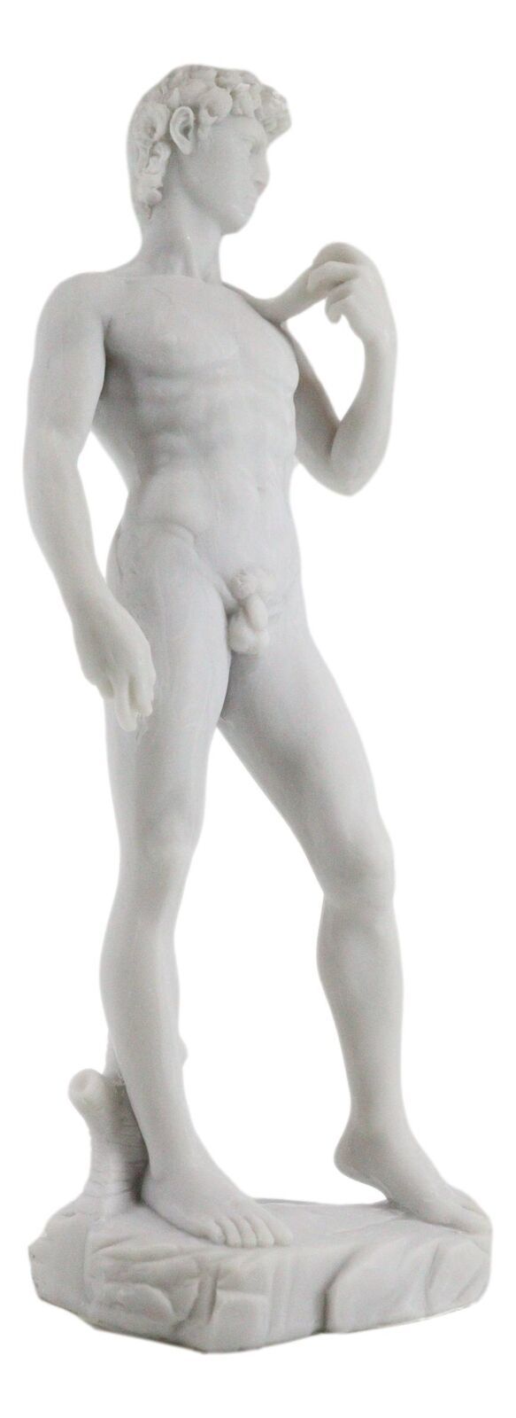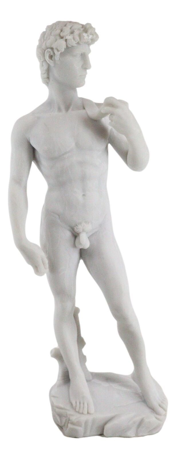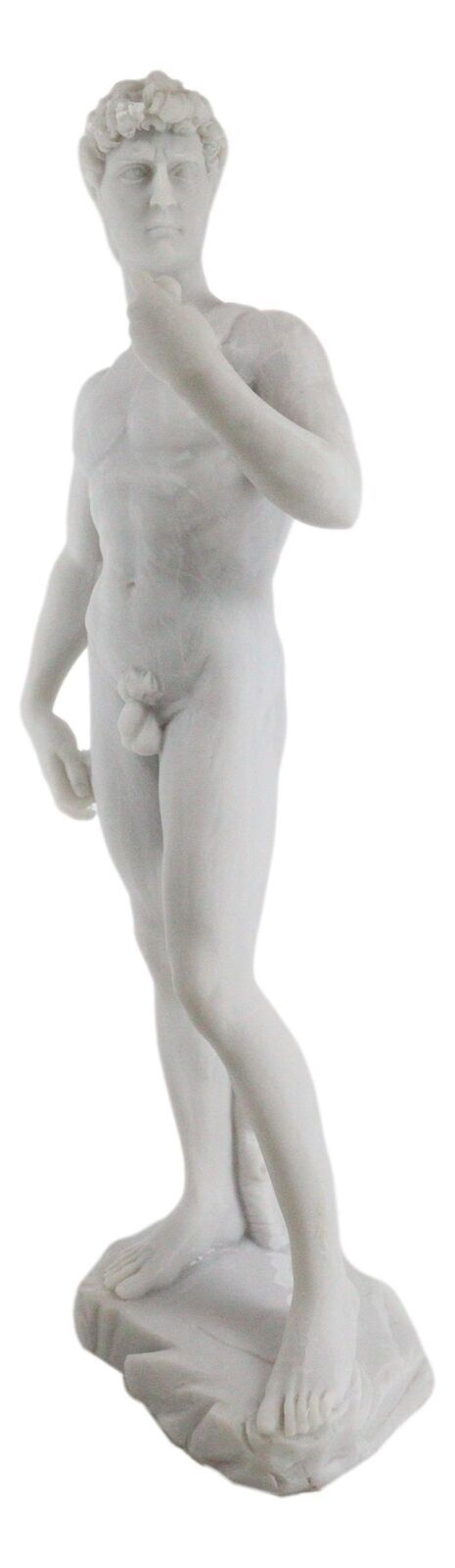 ? David is a masterpiece of Renaissance sculpture created in marble between 1501 and 1504 by Michelangelo. David is a 5.17-metre (17.0 ft) marble statue of a standing male nude. The statue represents the Biblical hero David, a favored subject in the art of Florence. This sculpture is a reproduction of the artwork built to display in the niches of your home!