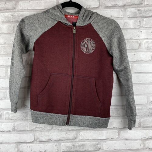 DKNY Full Zip Hoodie Sweatshirt Youth Size 6 Gray Maroon Burgundy Logo