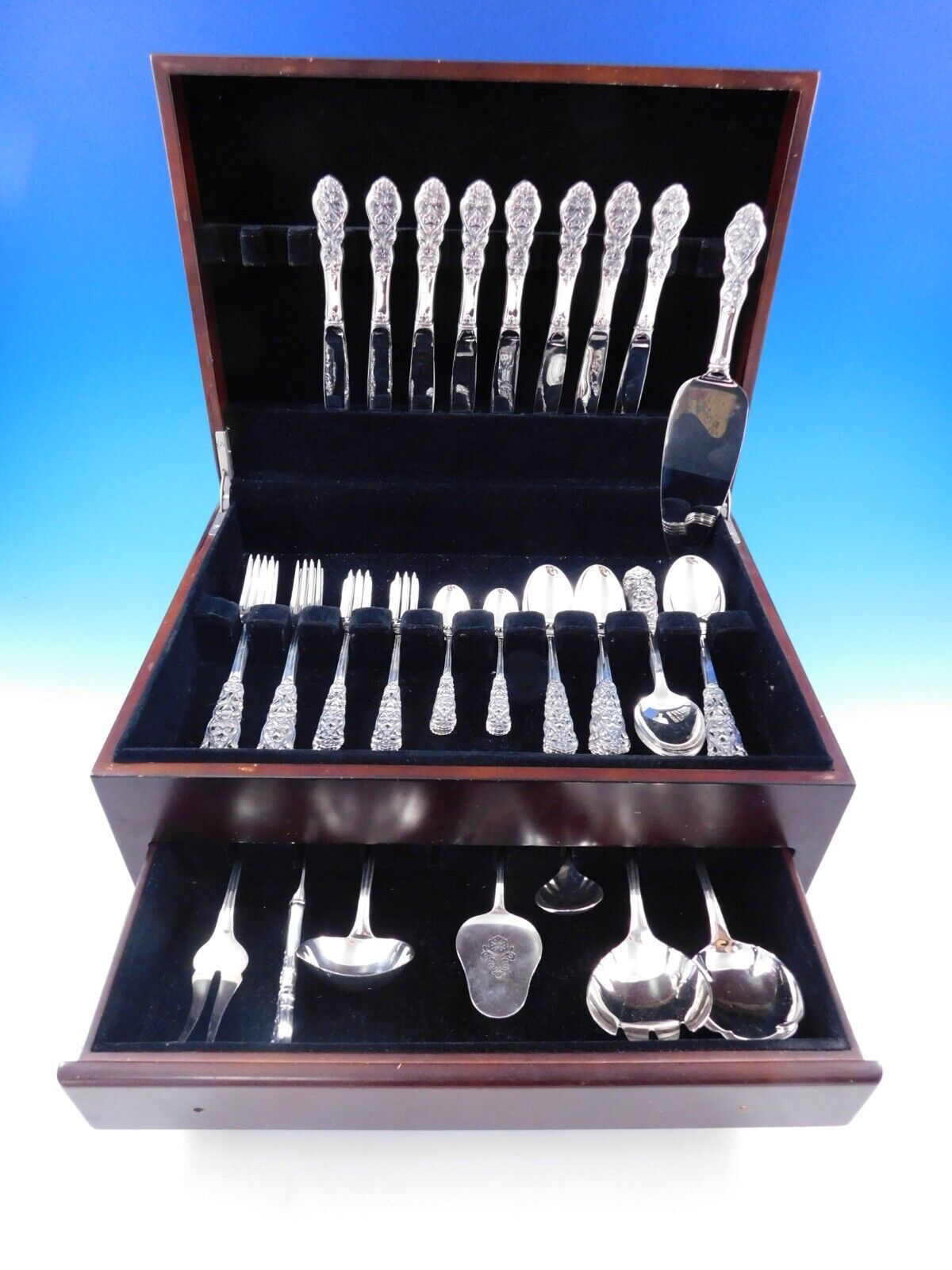 COMPLETE FLATWARE SETHOSTESS HELPERSHOLLOWWARE / TEA SETSMUSEUM QUALITY/FIGURAL SILVERFINE ESTATE VINTAGE JEWELRYMID-CENTURY MODERNSILVER FLATWARE SILVERWAREBuccellatiChristofleGeorg JensenNew Georg Jensen HollowwareNew Georg Jensen JewelryGorhamInternationalLuntMichael Aram - NewReed BartonTiffany Co.TowleWallaceWhitingPLACE SETTINGS