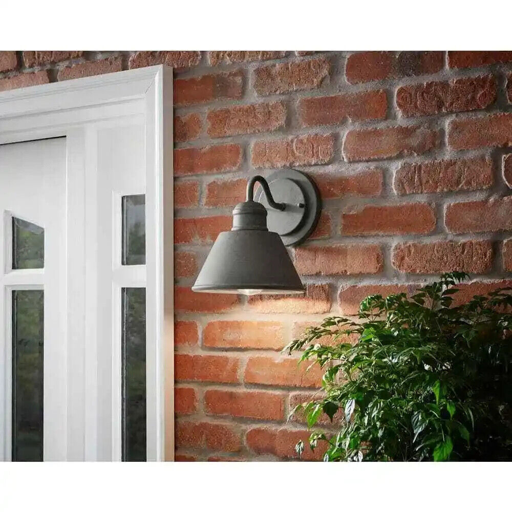 The Hampton Bay 1-Light Outdoor Zinc Barn Light Wall Lantern is designed with an aged look that will enrich your home. Hand-painted in zinc and lightly stained, the lantern offers illuminating ambiance to a given outdoor area. Uses 1-60-Watt medium base bulb or CFL equivalent (not included).