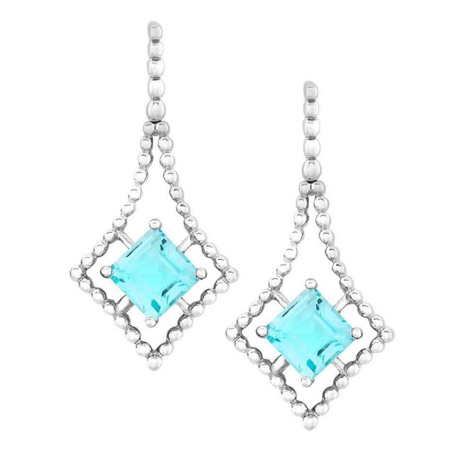 Sterling Silver Open Beaded Square with Center Square Blue Topaz Earrings