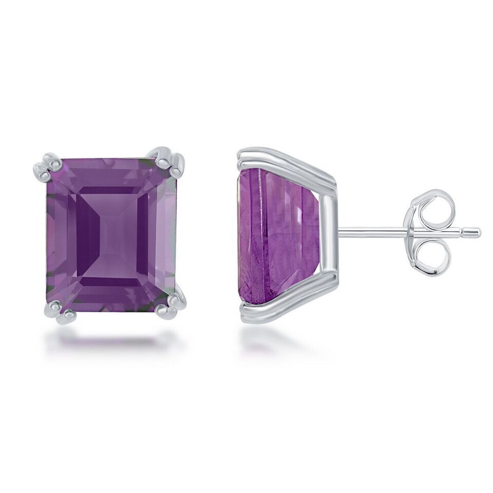 Sterling Silver Rectangle Prong Set Gem Stud Earrings - Amethyst