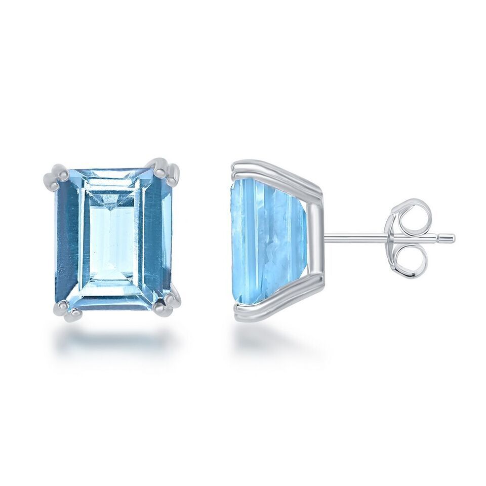 Sterling Silver Rectangle Prong Set Gem Stud Earrings - Blue Topaz