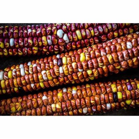 Each spectacularly colorful, 8-inch ear is unique; all are a blast of warm autumnal tones! Discovered as a chance variation of Papa's White by grower/breeder Ed Schultz. Ed crossed and selected, achieving this amazing parching or flour variety. Takes cool soil and cold nights, like all of Ed's Montana-grown creations.