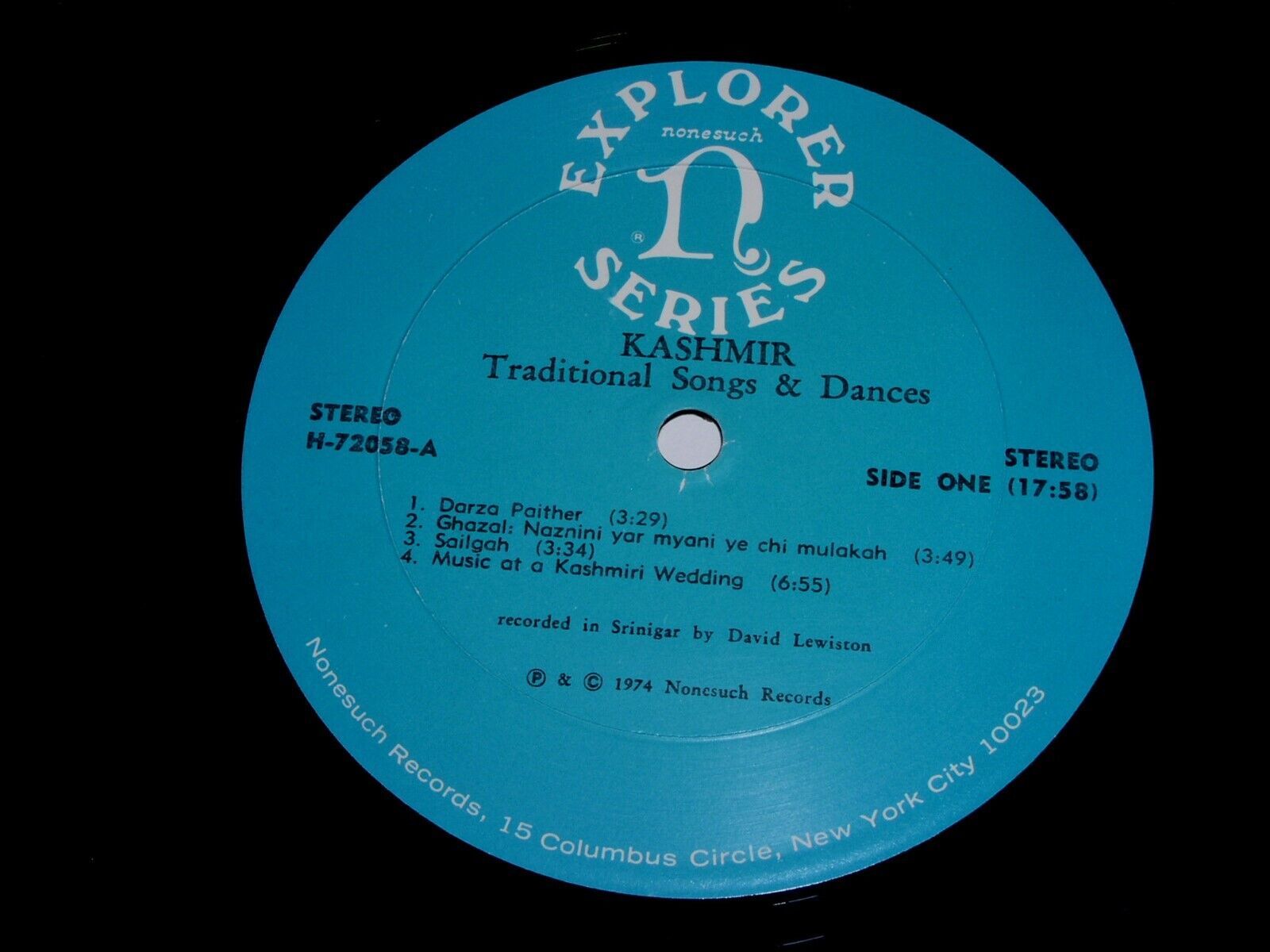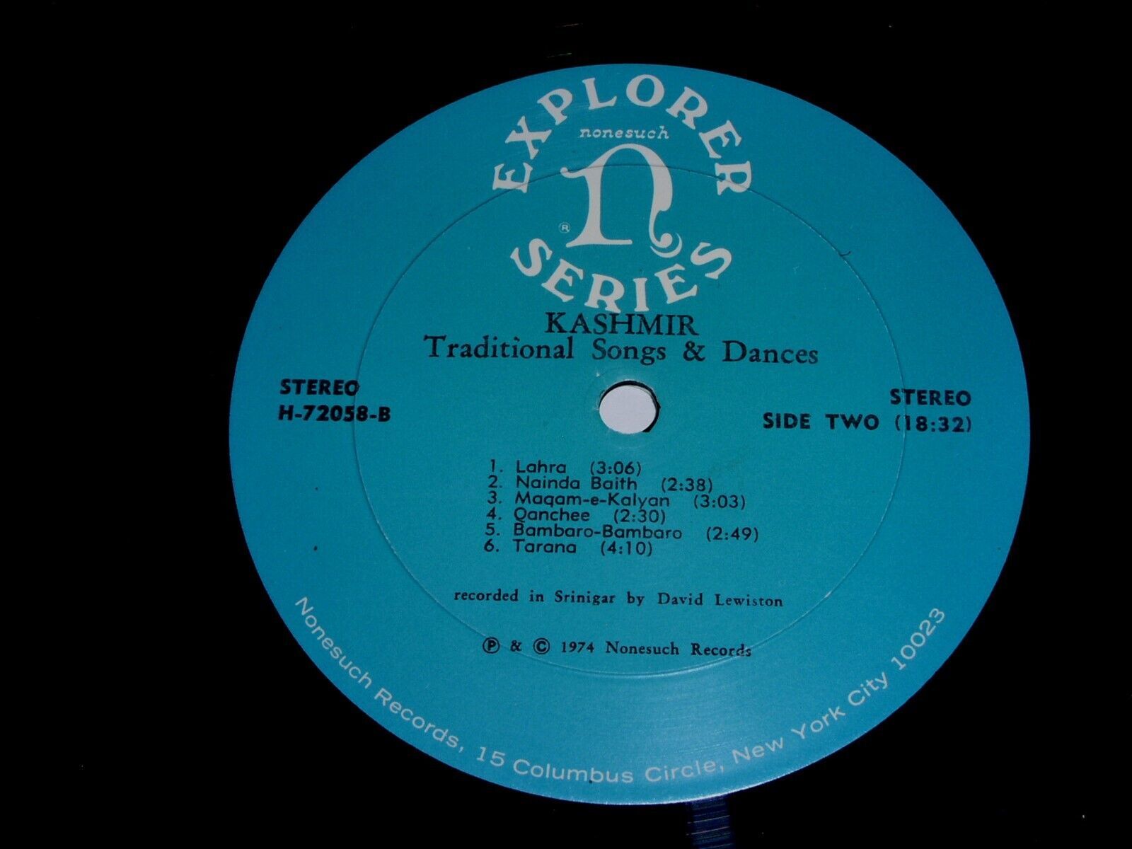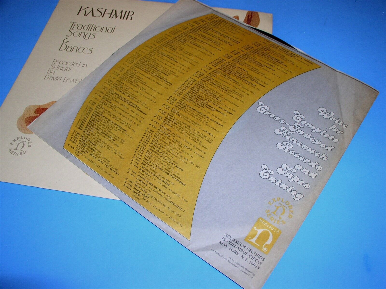 This is a vintage phonograph record album by David Lewiston, entitled, "Kashmire Traditional Songs Dances". Record label: Nonesuch H-72058 Explorer Series (Stereo). Dated 1974. Record comes with the original Nonesuch inner sleeve as shown.