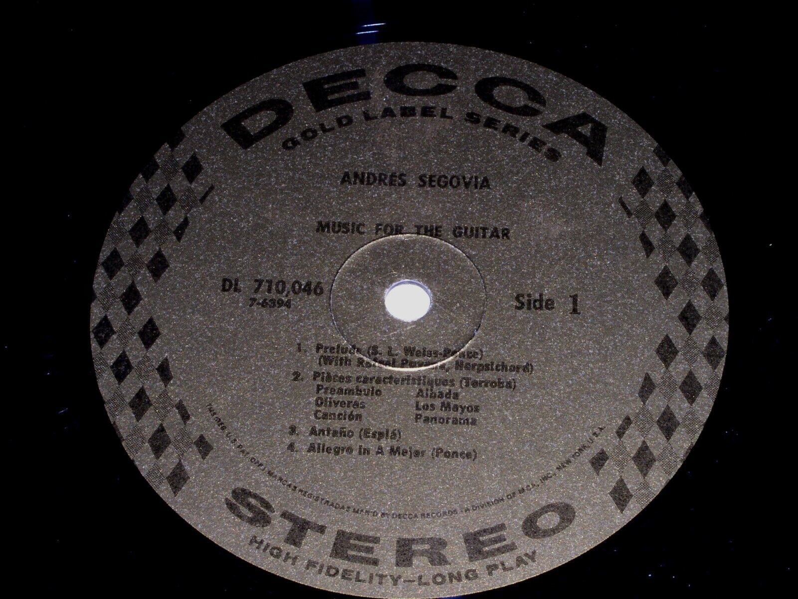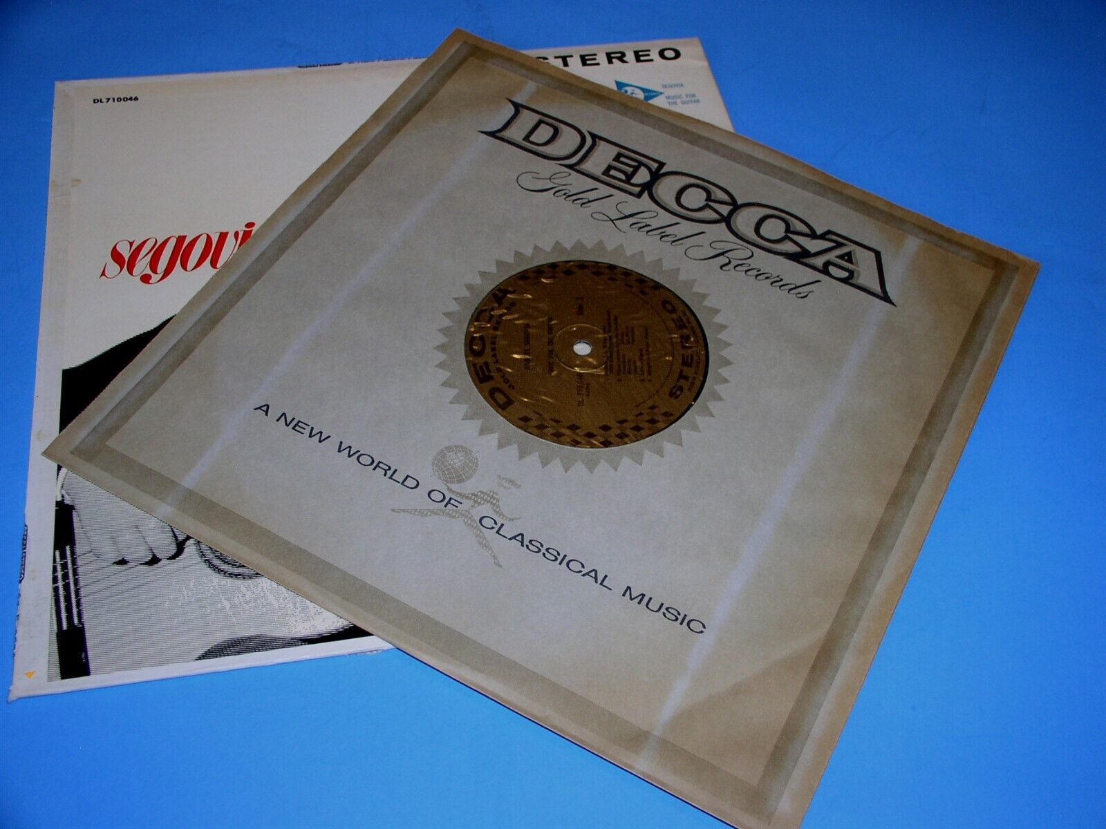 This is a vintage phonograph record album by Andres Segovia, entitled, "Segovia Music for the Guitar". Record label: Decca Gold Label Series DL 710076 (Stereo). Record comes with the original plastic lined Decca inner sleeve as shown.