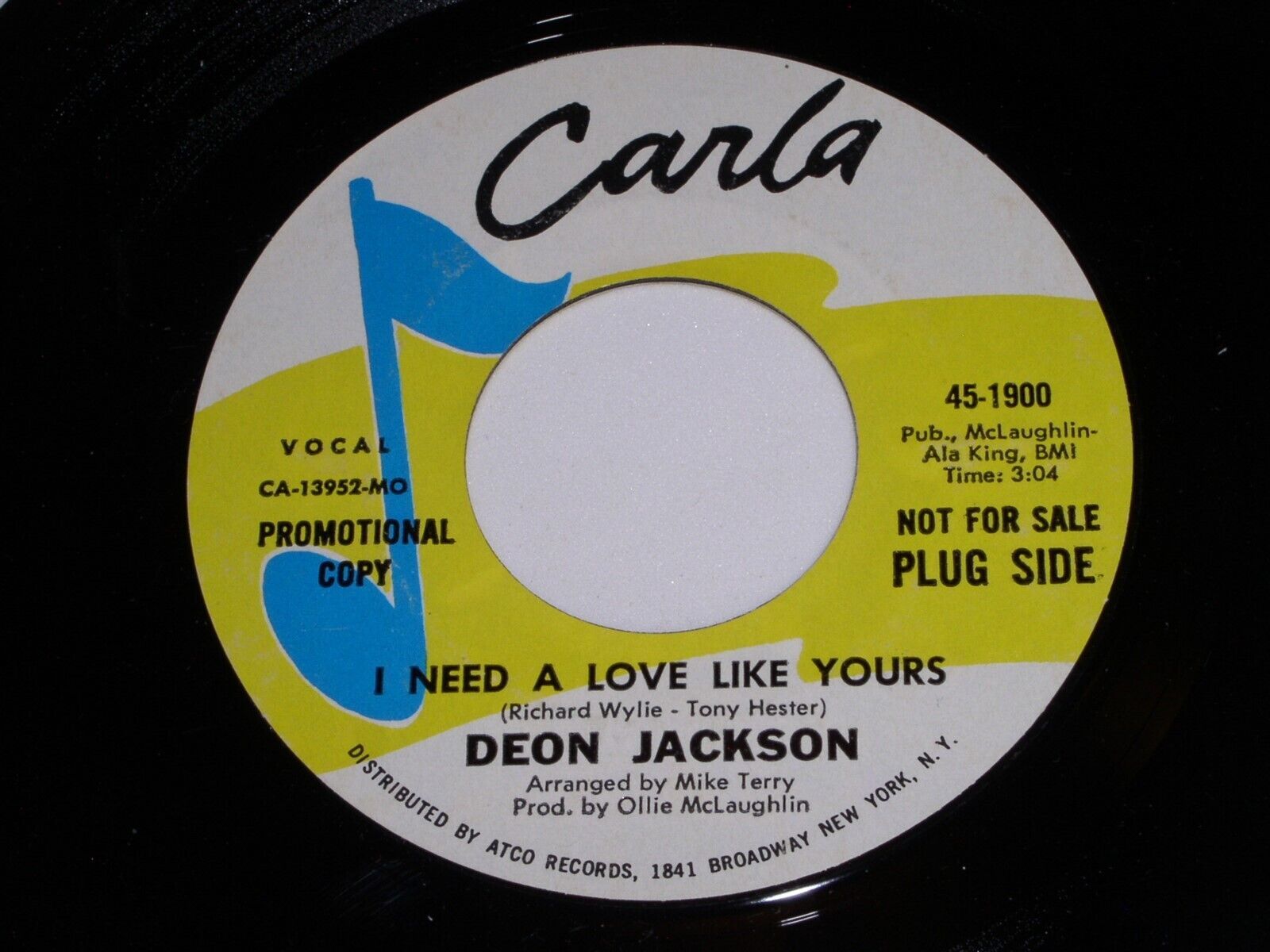 This is a vintage promotional 45 rpm phonograph record by Deon Jackson, entitled, "I Need A Love Like Yours". Flipside: "I Can't Go On". Record label: Carla 45-1900.