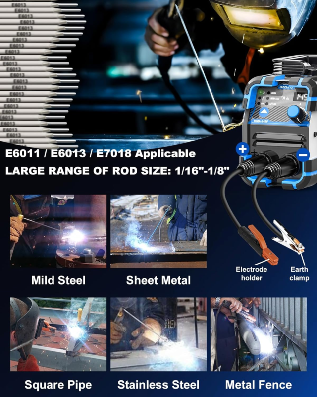 AZZUNO MMA-145 can weld E6011, E6013, and E7018 welding rods with a diameter ranging from 1/16" to 1/8".