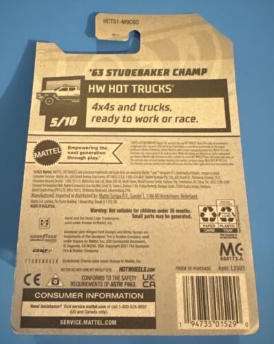 This Hot Wheels diecast vehicle is a must-have for any collector or fan of Studebaker pickup trucks. With its black color and detailed design, this 1:64 scale model of the '63 Studebaker Champ is a perfect addition to any collection. It comes unopened in its original box and ships securely. This particular model is part of the Hot Wheels HW Hot Trucks series, and is numbered 93 out of 250 in the 2022 mainline release.New old stock. See photos as they are part of the description and show condition. Box/Package may have signs of age,wear, and handling. We do occasionally use stock photos to better show products - however all listings show actual product photos as well to help show condition.