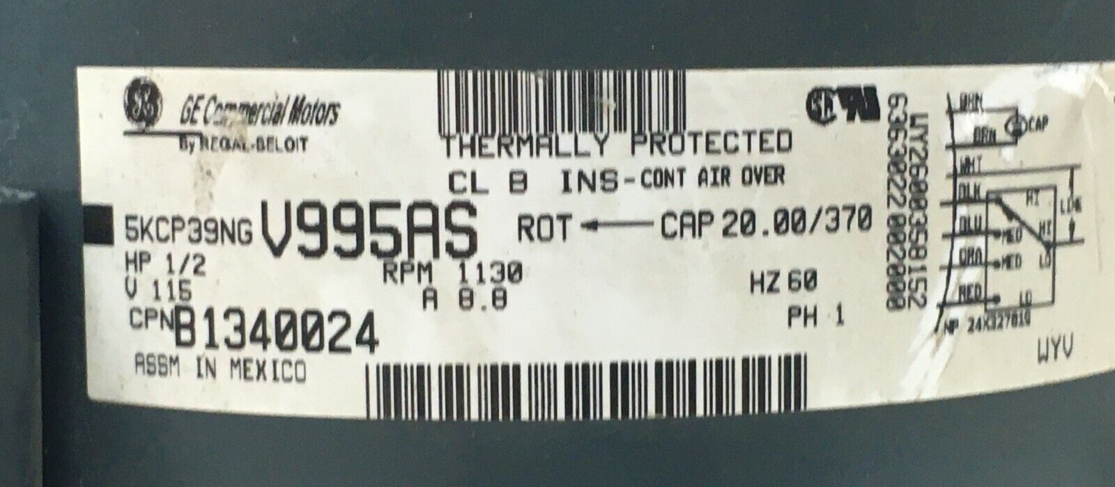This is GE 5KCP39NGV995AS Blower Motor 1/2 HP 1130 RPM 1PH 115V 60Hz B1340024 used part.