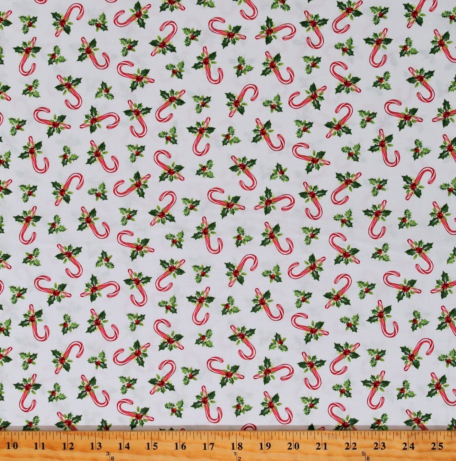 Cotton Jolly Old St. Nick Christmas Candy Canes Holidays Seasonal Winter Holly and Ivy White Cotton Fabric Print by the Yard (25366-10)