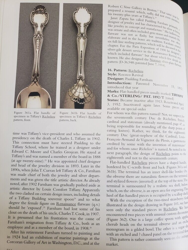 George Paulding Farnham (1859-1927) was born in New York City. His aunt married Charles T Cook, who assumed presidency of Tiffany after the death of Charles L Tiffany in 1902. Farnham attended Tiffany school and was trained by Edward C Moore and Charles Gosjean. He stayed with Tiffany and eventually became a board member in 1888 and in 1893 was appointed chief designer and head of jewelry later also assuming the role of artistic director of the silver department as well. His flatware designs were similar to jewelry designs, very ornate, elaborate, and in "beaux arts" tradition. He created six full sterling lines for Tiffany during his time, before leaving Tiffany in 1908.