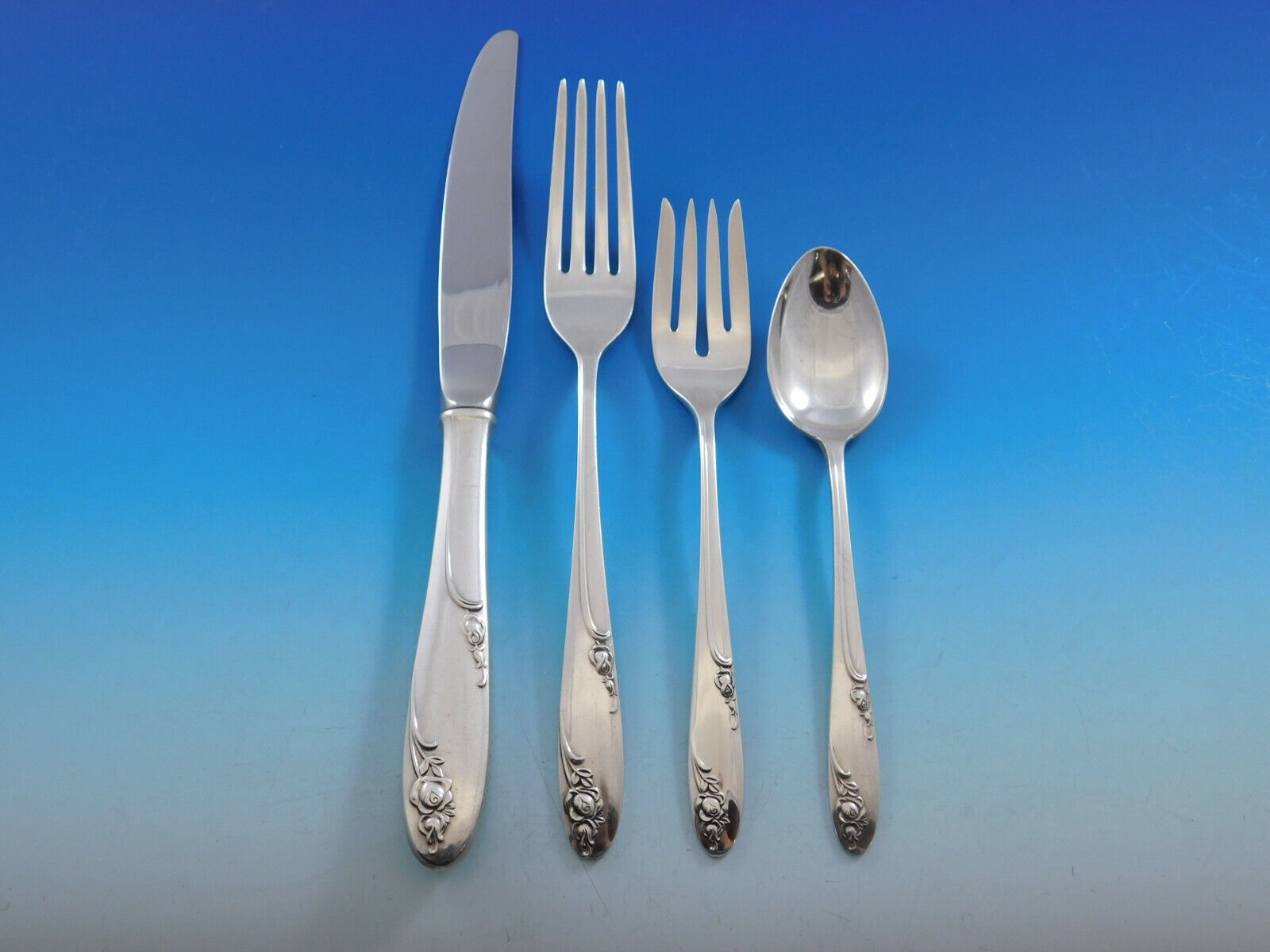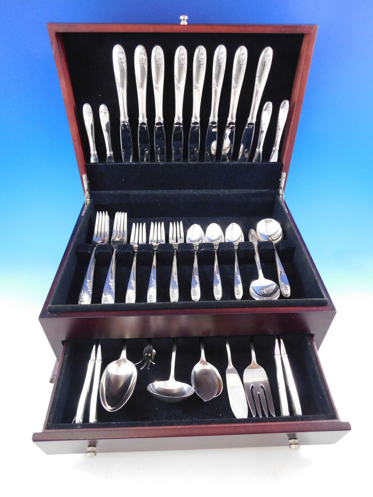 Scarce Dinner Size Rosecrest by Alvin sterling silver Flatware set, 56 pieces. This set includes: