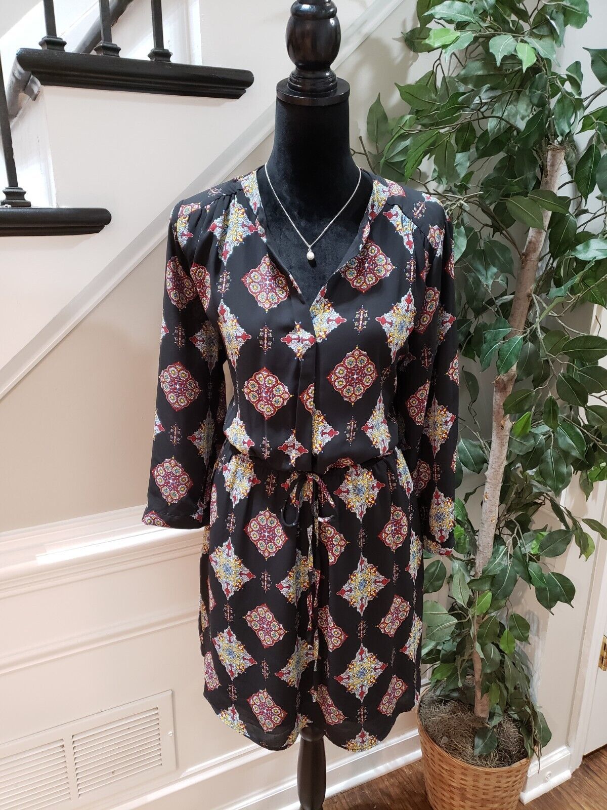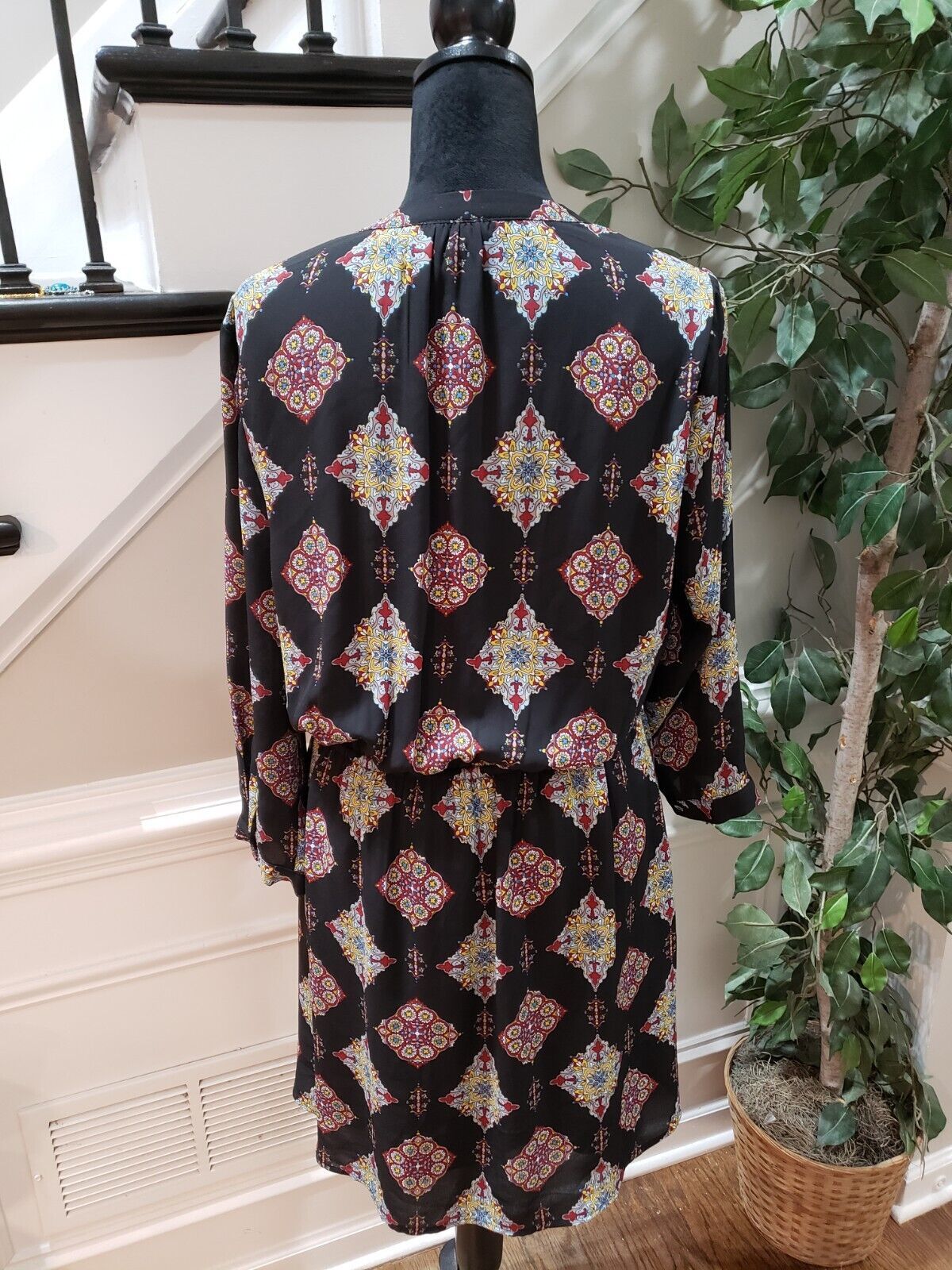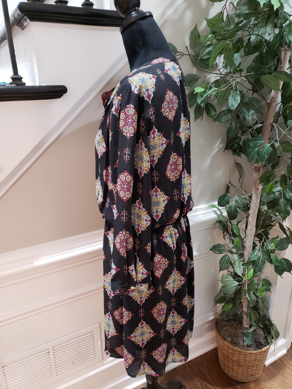 DR2 Women's Black Floral Polyester V Neck Long Sleeve Knee Length Dress Large