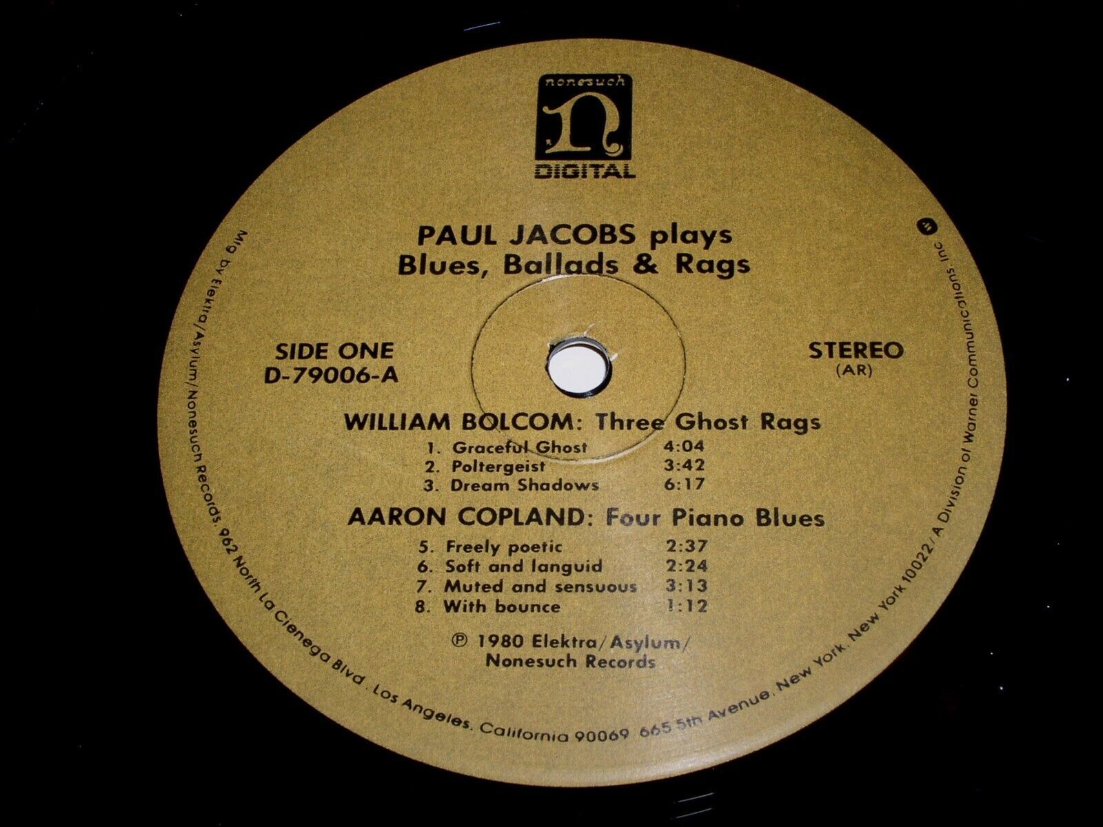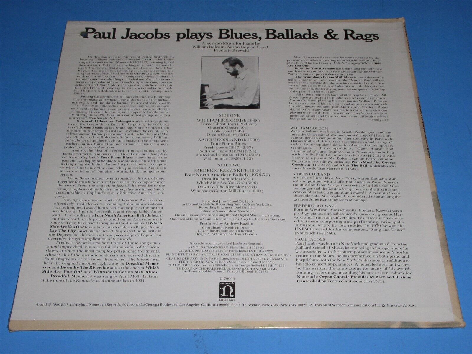 This is a vintage phonograph record album by Paul Jacobs, entitled, "Paul Jacobs Plays Blues, Ballads Rags". American Music for Pinao By William Bolcom, Aaron Copland, Frederic Rzewski. Record label: Nonesuch Digital D-79006 (Stereo). Dated 1980. Record comes with the original plastic inner sleeve as shown.