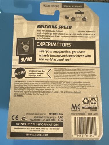 Get ready to race with this brand new 2022 Hot Wheels car from the Experimotors series. The Bricking Speed model is a 1:64 scale diecast car, featuring a multi-color design and the iconic Hot Wheels logo. This unopened box ships in a protective container to ensure pristine condition upon arrival.