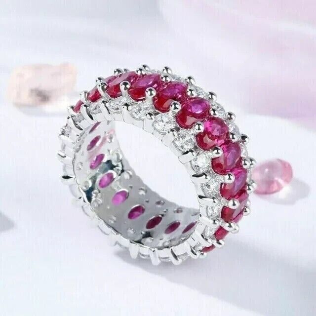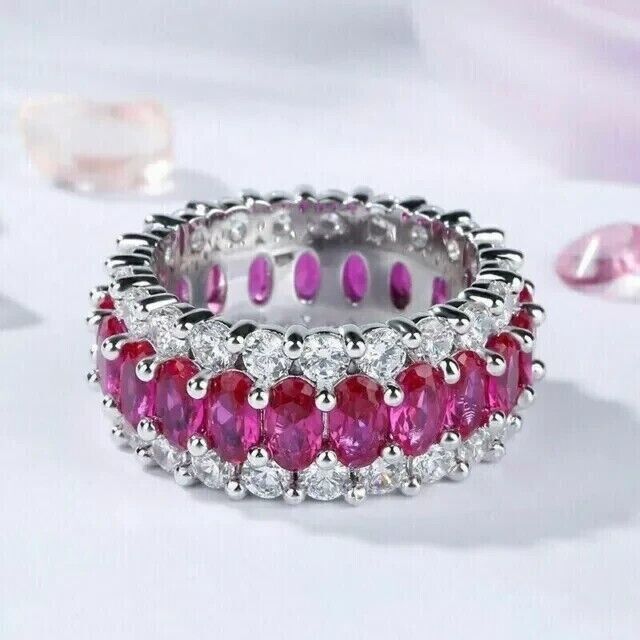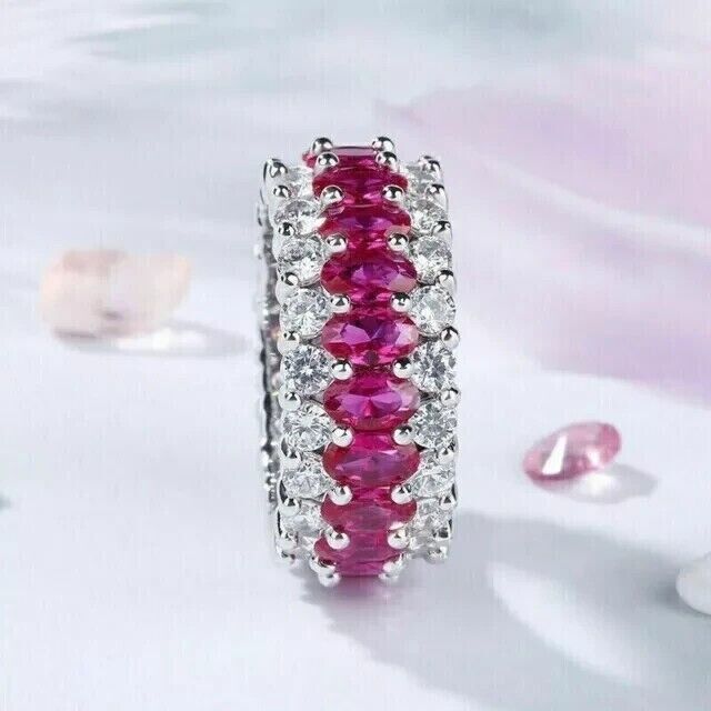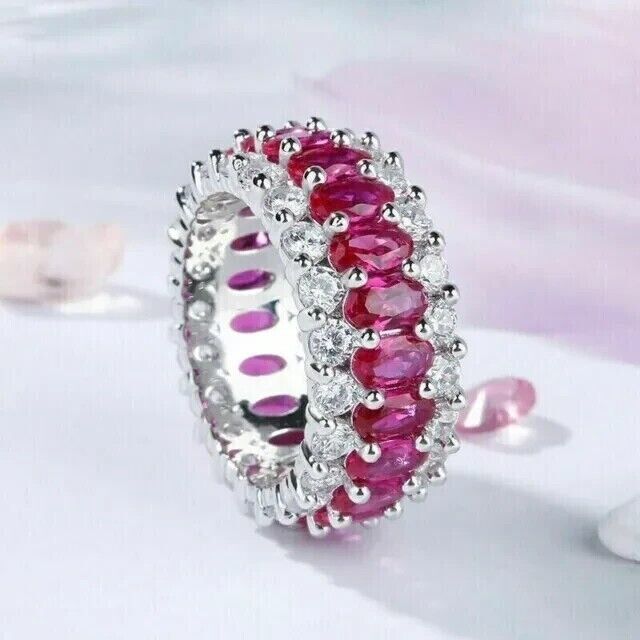 2Ct Oval Cut Lab Created Pink Ruby Wedding Band Women Ring 14K White Gold Plated
