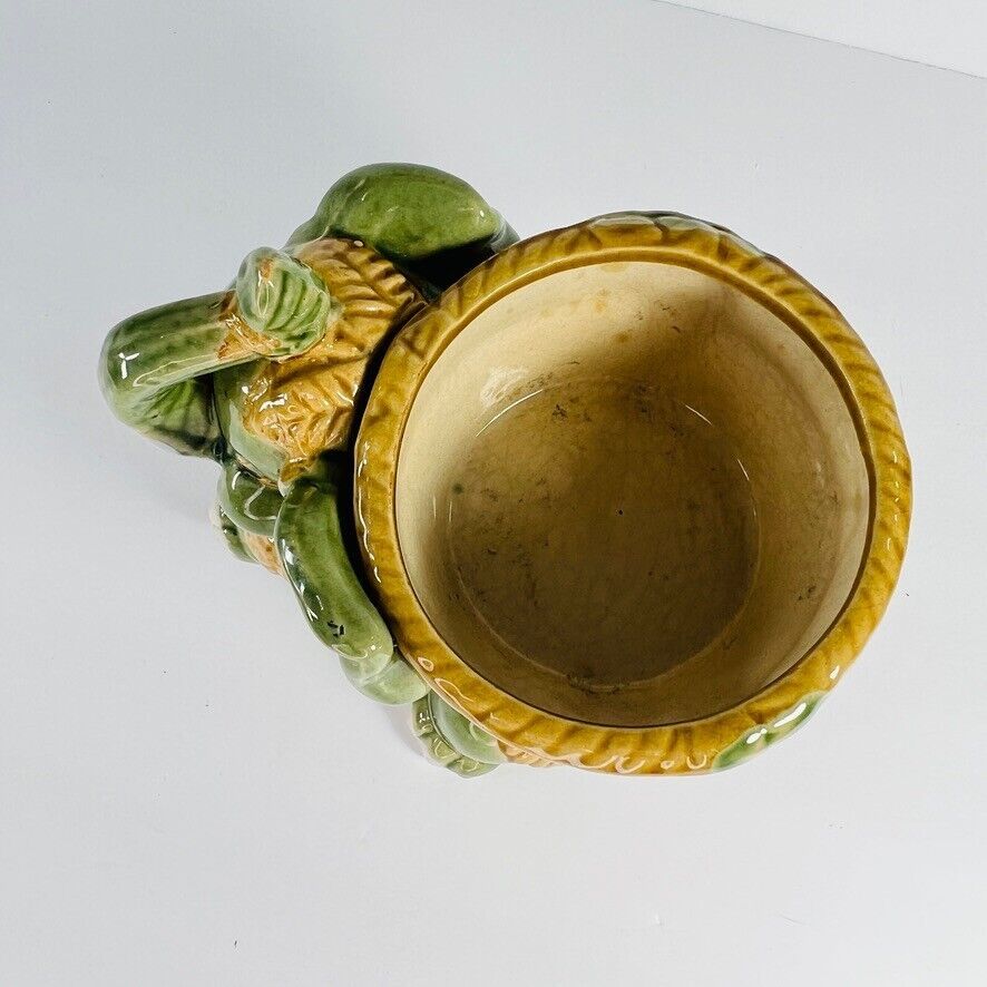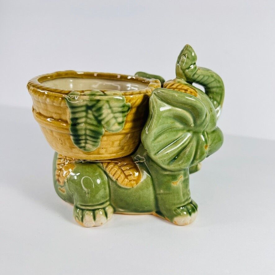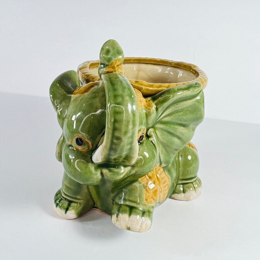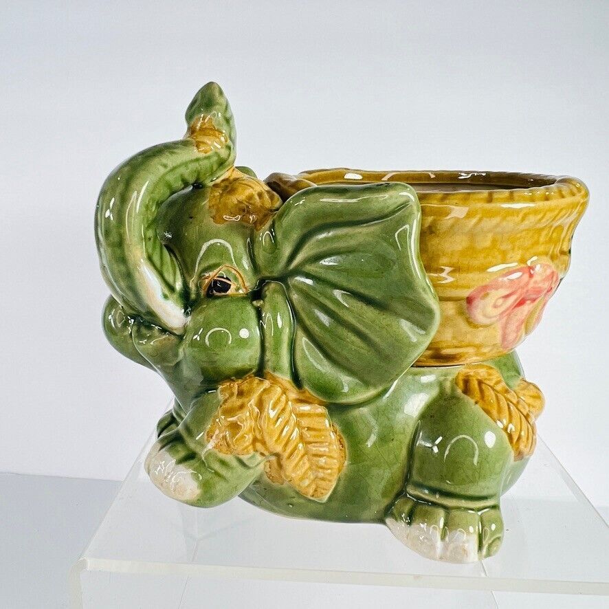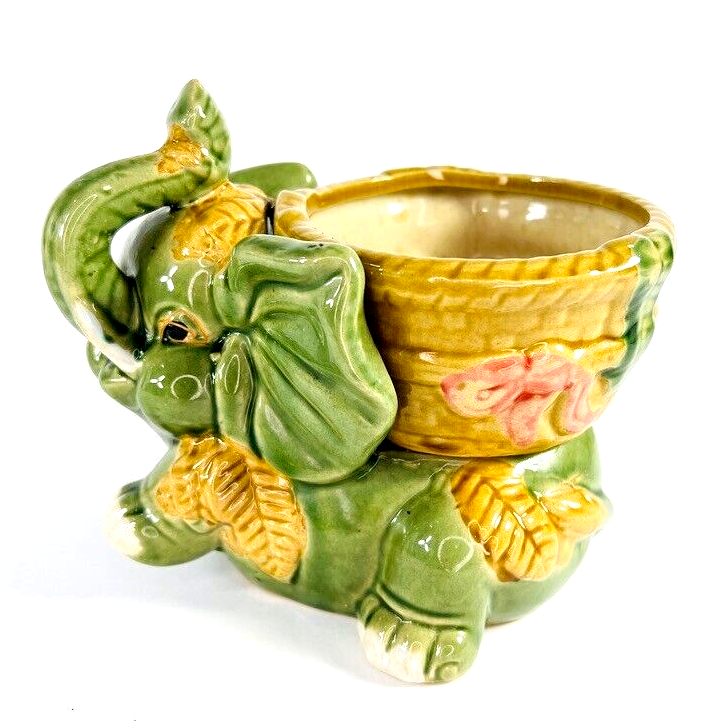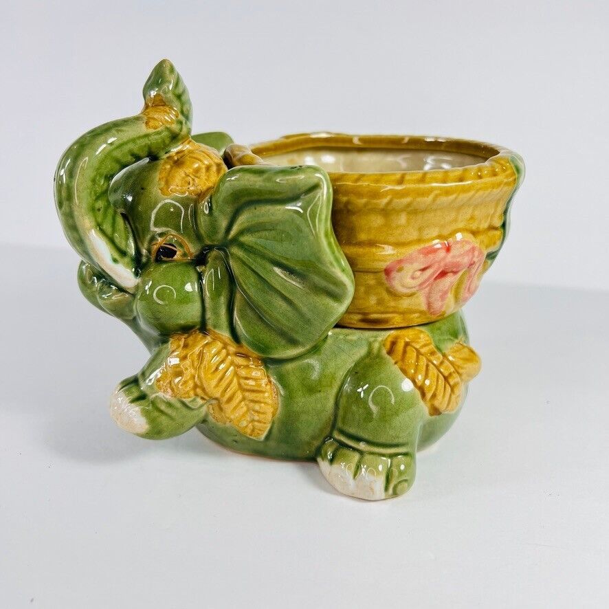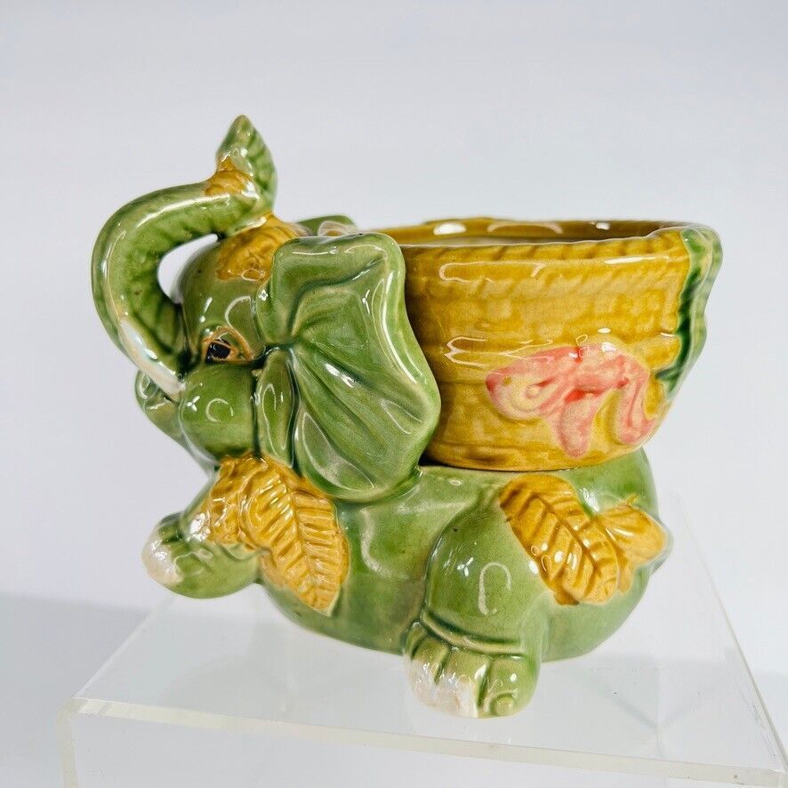 Vintage 1950s Ceramic Happy Elephant Trunk Up Good Luck Planter Basket Bow