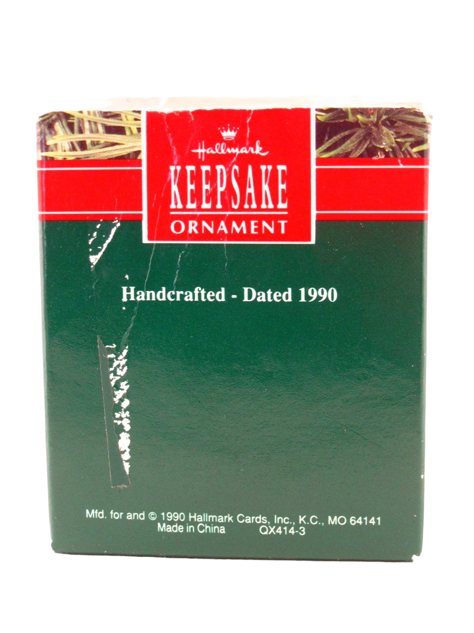 This Hallmark Keepsake ornament from 1990 features an adorable kitten with a Christmas theme. The item measures 2-1/2" in height, 1-1/2" in width, and 1-5/8" in length. It is categorized as a collectible in the Ornaments and Holiday Seasonal categories.