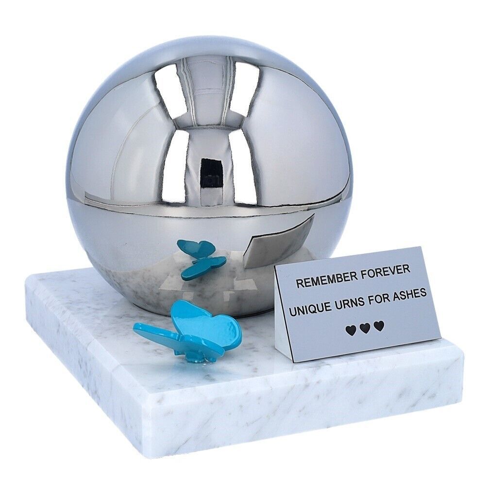 Introducing our Child Cremation Urn, a tender tribute to the memory of a beloved little one. Crafted with care, this urn features a stainless-steel sphere gracefully set upon a marble base, symbolizing eternal purity and strength. Adorned with a delicate butterfly motif, it brings a touch of natural beauty to honor the cherished memories of a precious child.