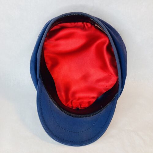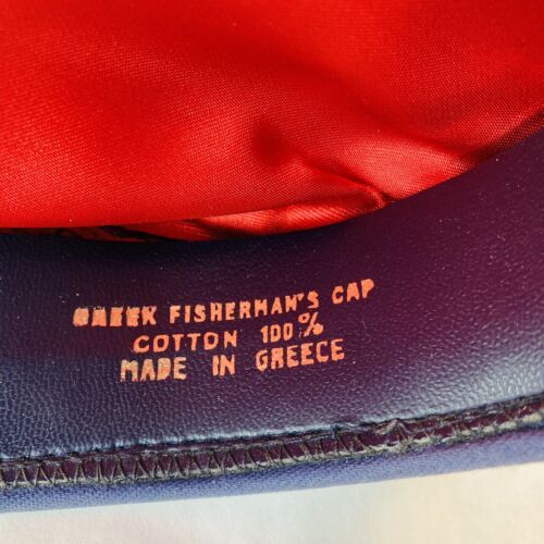 This is an awesome Fisherman/Mariner's style hat cap. It is 100% cotton and is a fitted style in size Large 7 3/8.. Made by unbranded in Greece. Great details include a braided cord around the front and navy blue trim and red satin lined interior. Great vintage condition with no visible signs of wear. See all photos for condition and measurements.