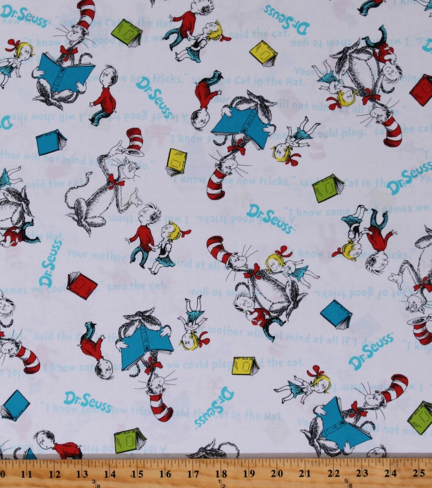 Cotton The Cat in the Hat Kids Dr. Seuss White Fabric Print by the Yard D679.65