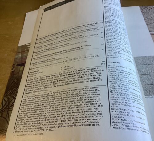 AIA Journal September 1978. Monthly publication of the American Institute of Architects. Ex-library in good condition, does have loose pages. See pictures for table of contents. Feel free to email with questions. I do combine shipping on multiple purchases. Have a great day!