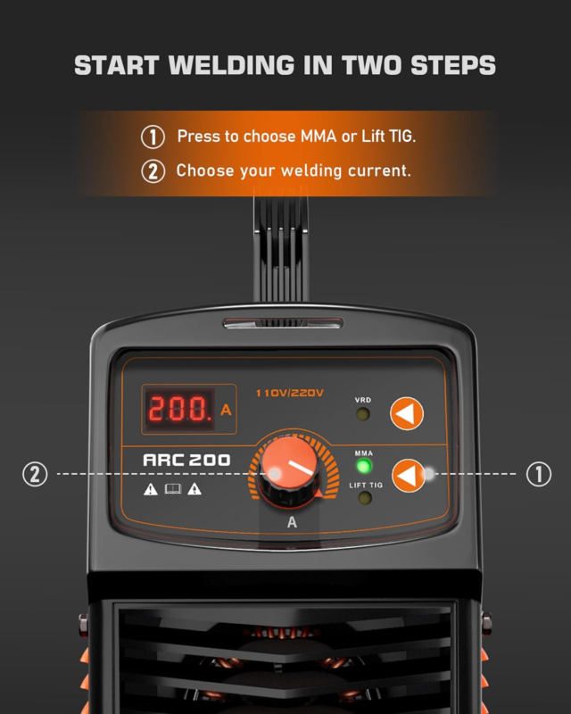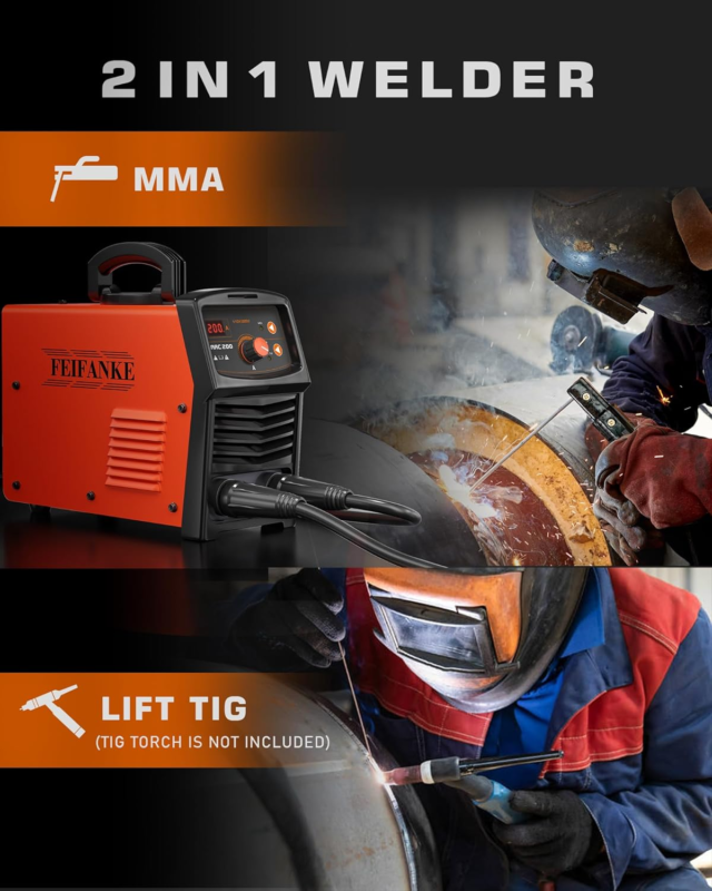 ?2-IN-1 MMA/Lift TIG Welder?One simple button to choose stick welding mode or lift TIG welding mode. Built in thrust compensation, fast arc start, non stick welding rod, providing a smooth welding experience. Lift TIG mode is also available, but the TIG torch is not included.